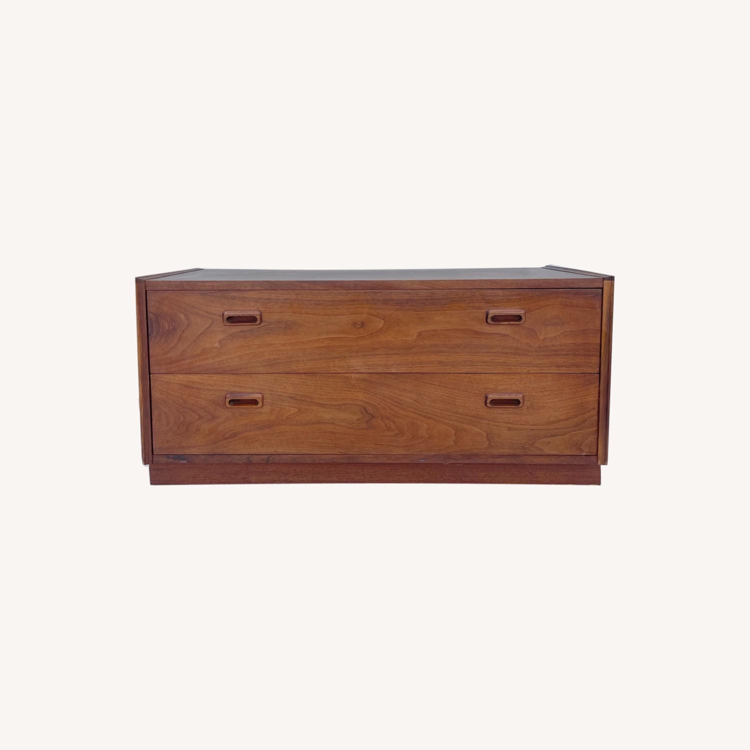 Seller's Notes:This unique mid-century modern two drawer dresser features walnut drawer fronts and a durable faux wood top. Uniquely sized low dresser is also the perfect size for use as a tv console with two spacious drawers for media storage. See photos, contact seller for details. Dimensions: 40w 18.25d 19h Condition: age appropriate wear, vintage finish worn, scuffs/scratches, edge wear, interior marks, minor chips- see photos