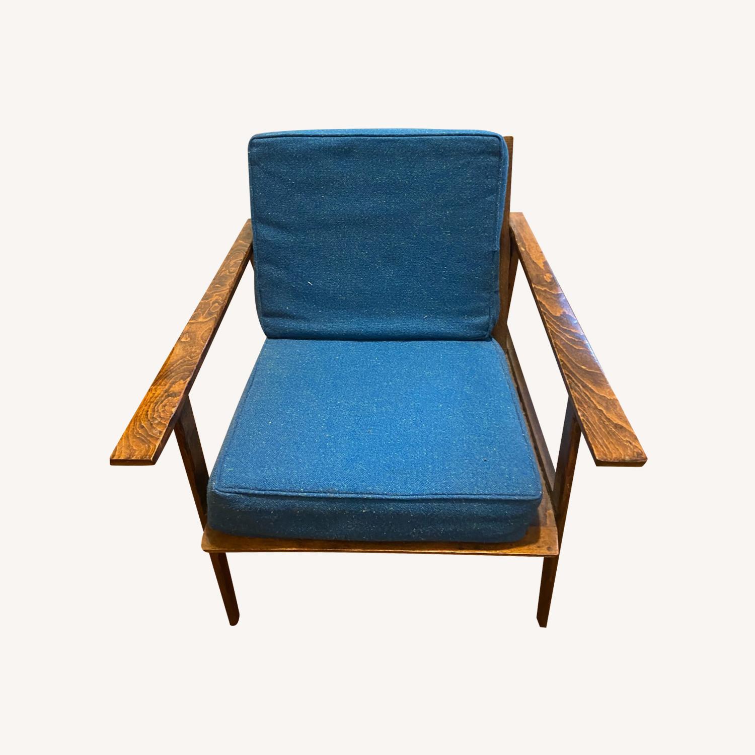 Seller's Notes:Beautiful and unique vintage mid-century modern armchair. Wooden base with blue accent cushions. I love this chair, but I'm redecorating and just have no space for it. Very comfy to sit and read in, and absolutely beautiful piece. Made in Yugoslavia.