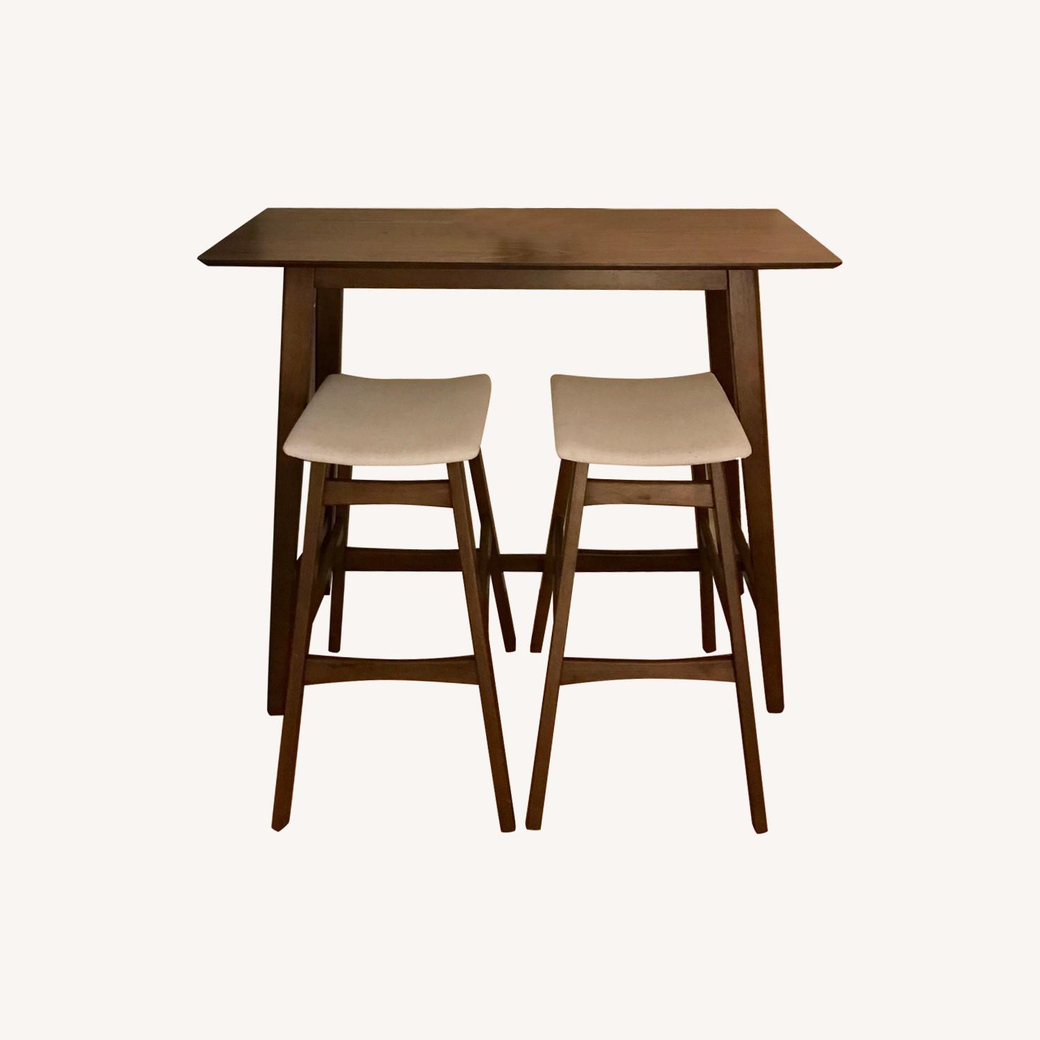 Seller's Notes:Beautiful counter height table with walnut wood and cream barstools. Purchased new a little over a year ago to help expand kitchen counter space in my tiny apartment, but also functioned nicely as a desk or breakfast bar. Perfect for a smaller space or a mid-century modern style upgrade.