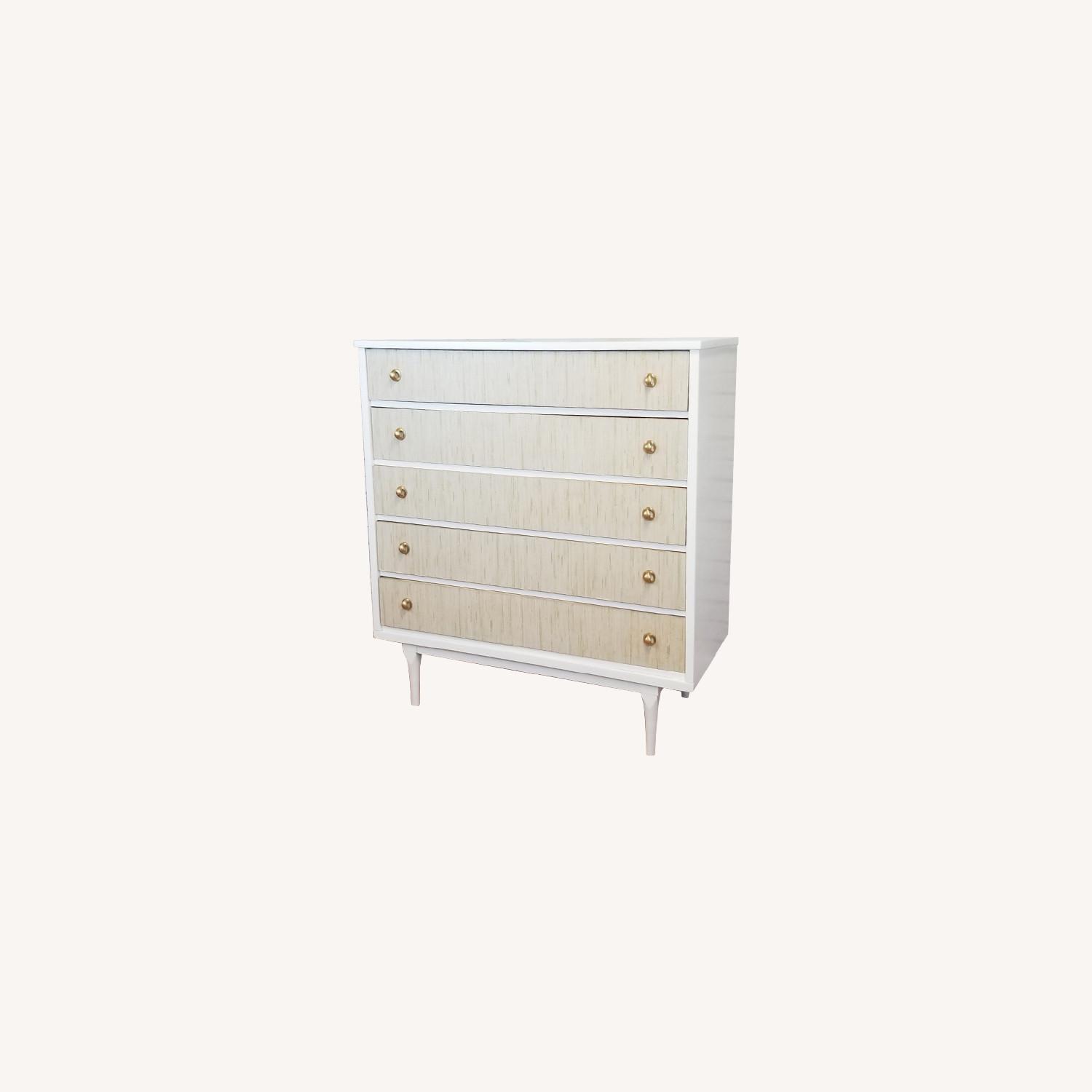 Seller's Notes:Beautifully refinished Mid Century Modern dresser. Painted a neutral white and accented with grasscloth drawer fronts and gold hardware. I am an interior designer that takes quality vintage furniture and transforms them into unique, artsy and designer styles!! One of a kind piece of furniture!! Check out my Etsy shop under RenoVista for reviews. Support your local artisans.