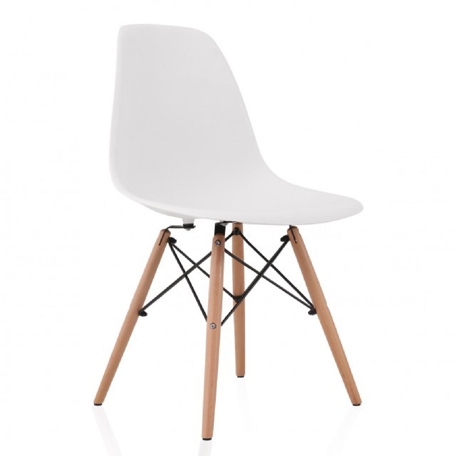 Seller's Notes:Contemporary Vintage White Molded Shell Designer Side Plastic Eiffel Chairs Wood Legs for Dining Room Living Office Conference DSW Desk Kitchen Comfortable As good as new Bought $250 2 months ago