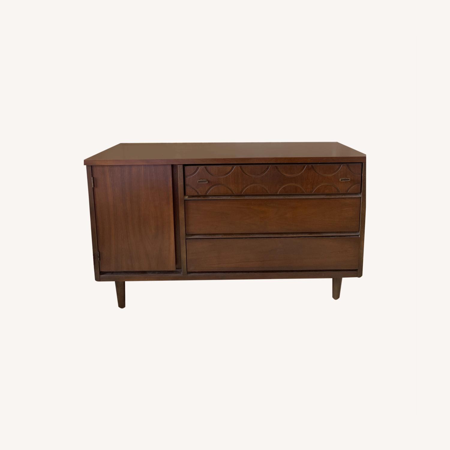 Seller's Notes:Hello! This is an adorable Mid Century Modern Dark Wood Sideboard, that I have been using as general storage and as a dresser! But I think this piece would be suited to also use as a sideboard in the living area, or kitchen. I think it could be great to also store your bar items on a tray on top, as the top drawer is lined in green velvet. The top dress is separated into little slats, which I just used to house my junk, but would be great to store longer utensils or napkins, etc. The drawers below would be great to house extra linens, but I've used to store my jeans and t-shirts. The side cabinet would be great to store knick-knacks and vases, but I've used it to house some extra beauty supplies. The top has some sticky residue, that is not really noticeable. I think it would come off with some goo gone and elbow grease. The piece is really great quality, I purchased it from a mid-century modern dealer in Brooklyn. The joints are dovetail joints, and the top drawer has a pretty design. The top drawer has a pretty engraved design with brass knobs, and the hinges on the side cupboard are exposed and brass. The legs are turned peg-style legs. SO CUTE. I love this piece and would love to keep it. But I need to make space for a desk due to WFH being more of a permanent situation!