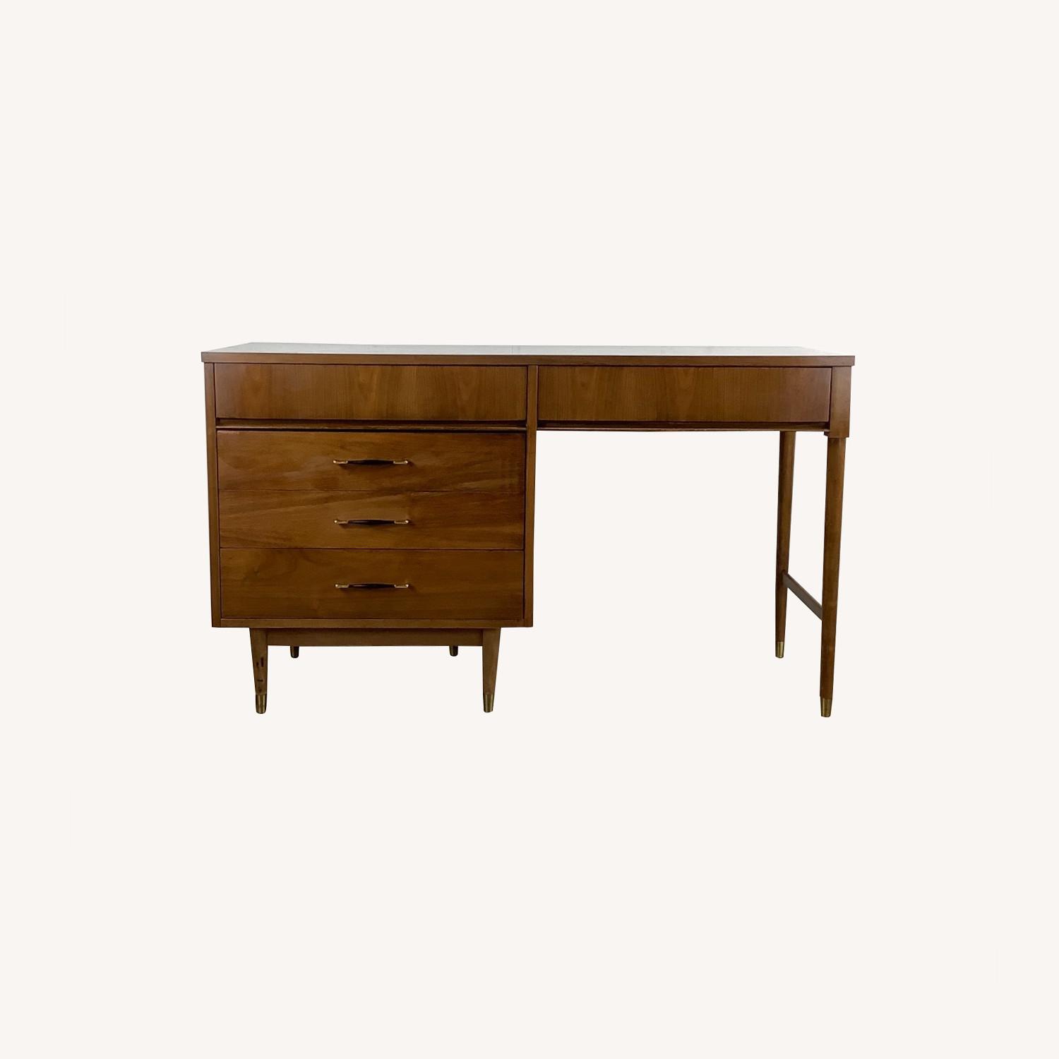Seller's Notes:This stylish mid-century modern writing desk boasts a warm vintage walnut finish combined with a durable faux wood laminate top making for an excellent workspace in any office. The four spacious drawers ensure plenty of room for organization while the tapered legs, brass sabots, and unique drawer pulls add to the mcm charm of the piece. Matching dresser also available- Dimensions: 54w 18d 32h Condition: age appropriate wear, vintage finish worn, scuffs/scratches, edge wear, chips, interior marks, missing rear stretcher, discoloration-see photos.