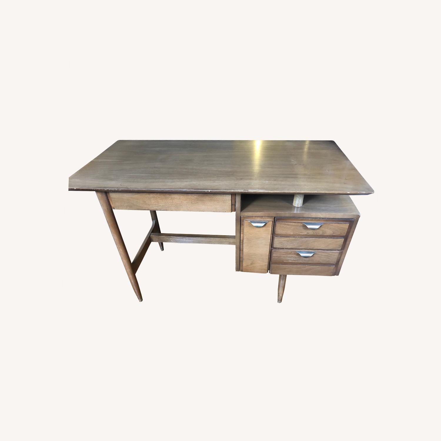 Seller's Notes:With three large drawers, a filing drawer, and tiered design, this vintage desk is perfect for any home office or study. Beautiful brass finishings make for classic Mid-Century design. This desk belonged to a doctor in Upstate New York for approximately 50 years.