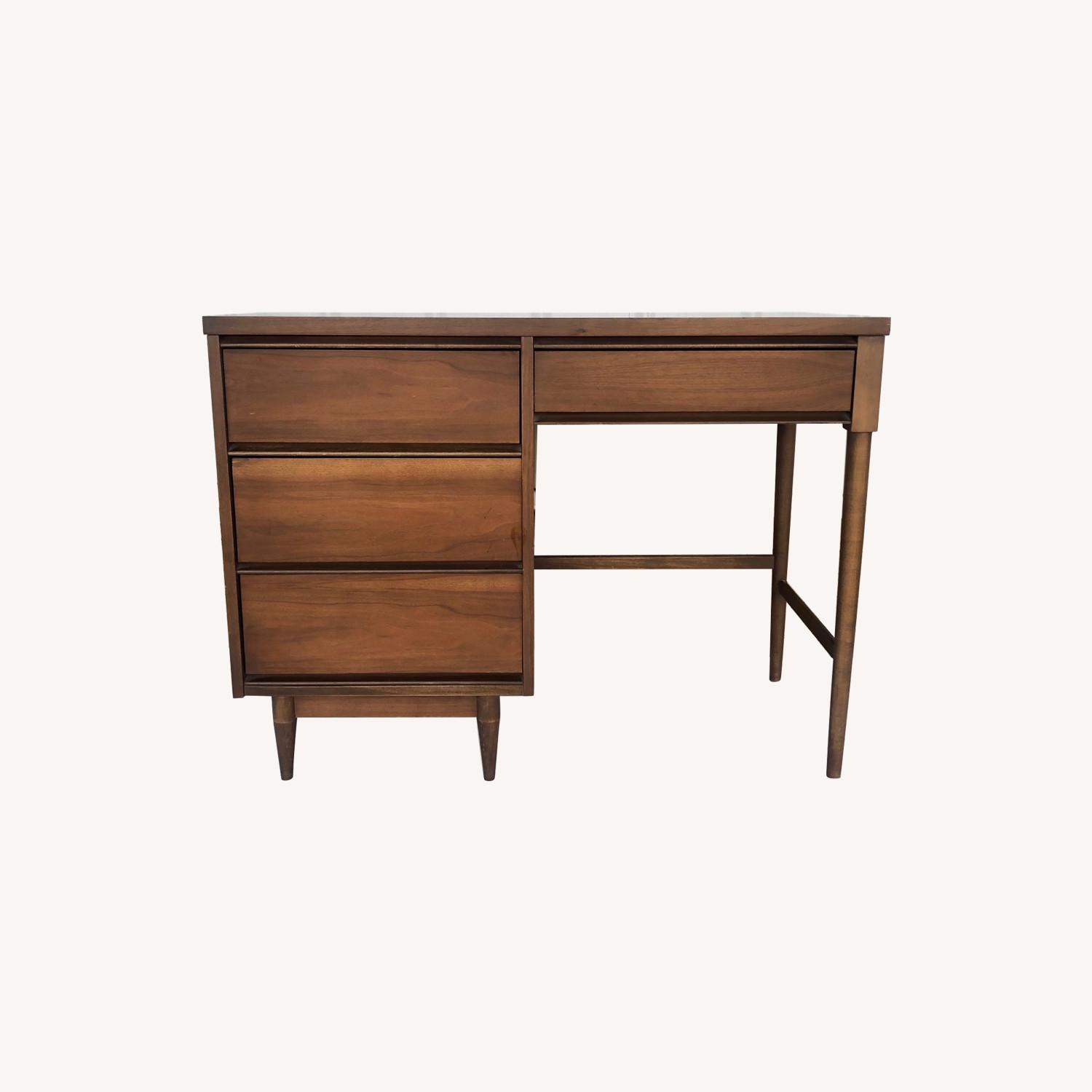 Seller's Notes:Vintage American walnut writing desk features formica style laminate top for a smooth and durable writing surface, offering several drawers for spacious office or bedroom storage. Dovetail construction and quality mid-century modern design make this an impressive work desk for any home or office interior. Dimensions: 46w 18d 29h Condition: age appropriate wear, vintage finish worn in areas, some heavy scuffing on side edge, surface scratches- see photos and contact seller for more information. Shipping: Additional delivery options may be available- please contact seller with Zip Code before purchase for more information.