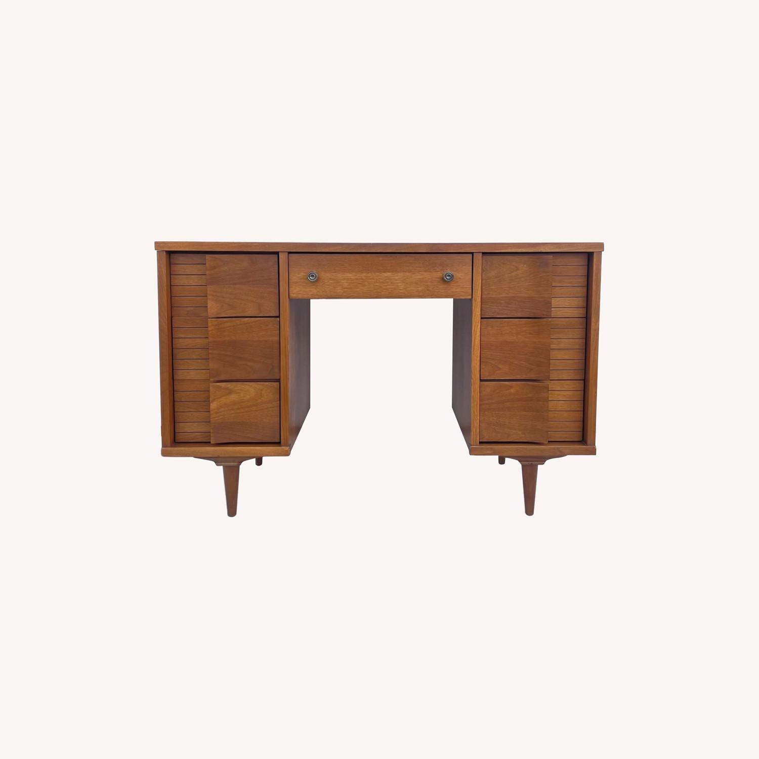 Seller's Notes:This stylish mid-century writing desk features striking curved front drawers with a formica-style writing top for a smooth and durable workspace. Narrow in depth at only eighteen inches, this petite desk is perfect for a bedroom study area or apartment laptop desk, managing to offer seven spacious dovetail drawers for office and home storage. Dimensions: 46w 18d 30h Condition: age appropriate wear, some scuffs/scratches, finish wear, edge wear, some interior marks, see photos.