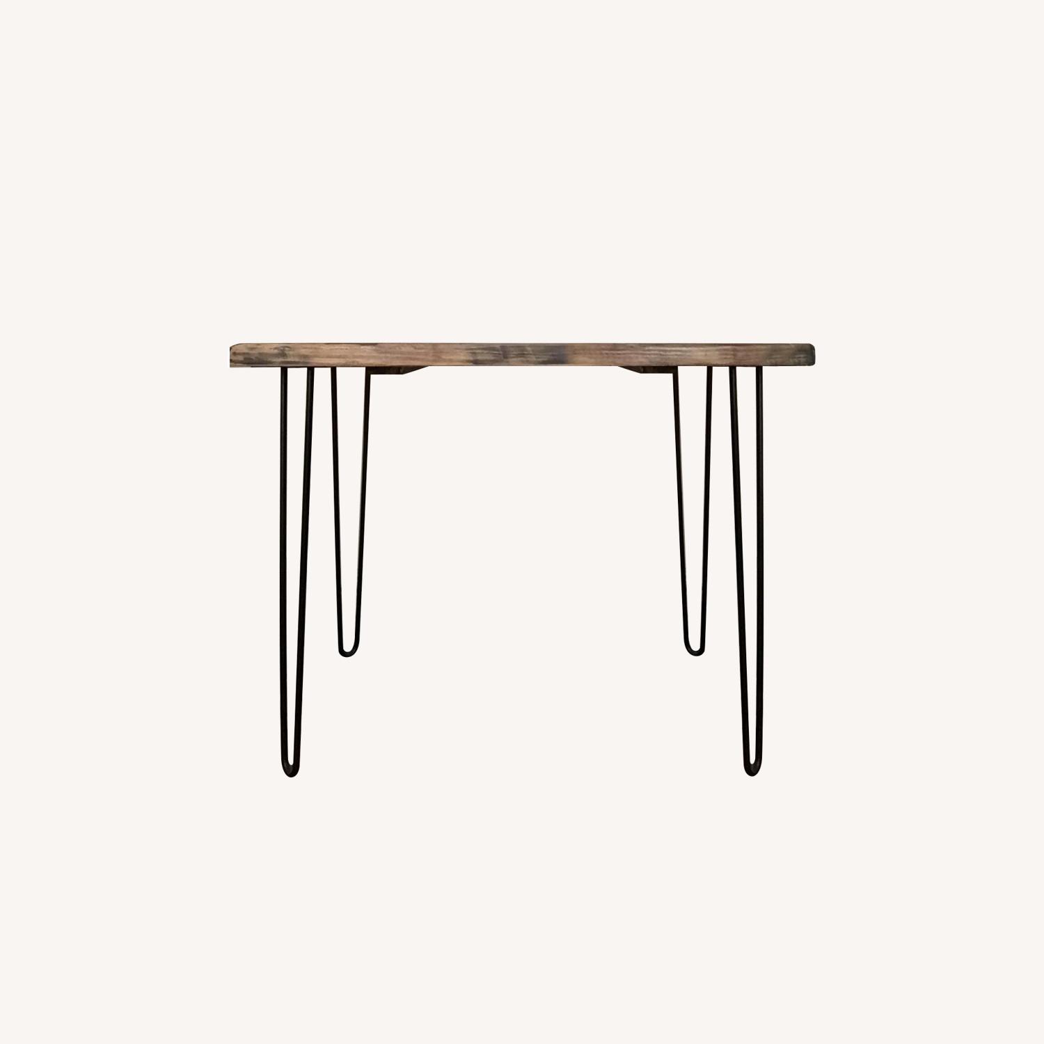 Seller's Notes:Custom-made midcentury-style solid wood desk. The table is made from weathered pine and has a rustic/distressed aesthetic (dark parts created through Japanese burning method). The table top is nearly 2'' thick, sanded smooth with a satin coat, and the hairpin legs are steel. The desk is very sturdy, and there are no real signs of wear beyond some minor scratches that blend into the distressed aesthetic. I love the desk and am only selling it to make more room for some other furniture. (Note: the catalog photo with the bird print and grey chair shows a slightly wider model than mine.)