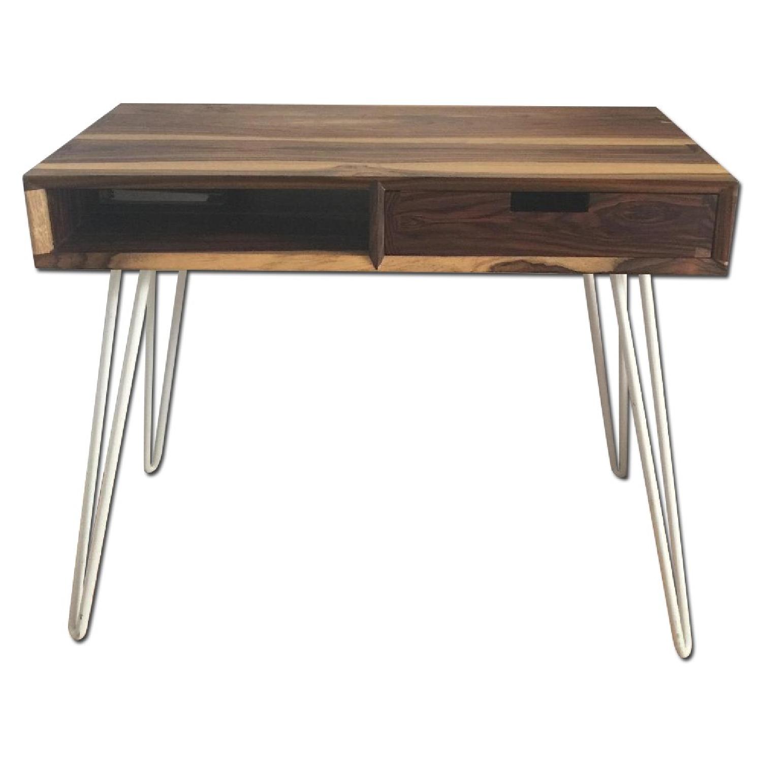 Seller's Notes:nearly-new mid century style desk. polished american walnut with steel legs powder-coated in white gloss. has one drawer and one open storage area. made in US, heavy quality, hardly used. 29 inches high, 36 inches across, 18 inches deep.