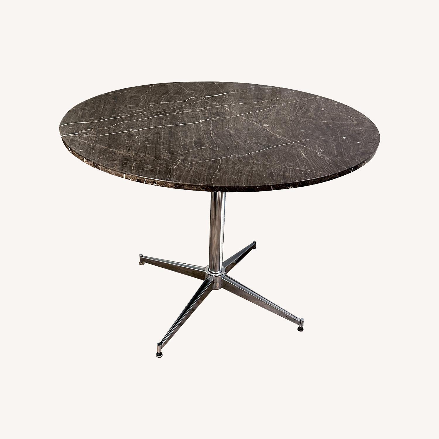 Seller's Notes: Circular Dining Table with Chrome Base and Composite Stone Veneer Top (Marble Look) - Midcentury style metal pedestal base with four adjustable height feet (for leveling on uneven floor.) - Composite stone veneer top has a warm brownish gray hue with white veining. - Very heavy and sturdy; top was not original to base. Please see photos to see bottom view (adhesive not visible unless you look at table from below.) - See photos for condition - several scratches to top and pitting to base metal and matte spots/rings to finish on top. Please feel free to make a lower offer given condition .