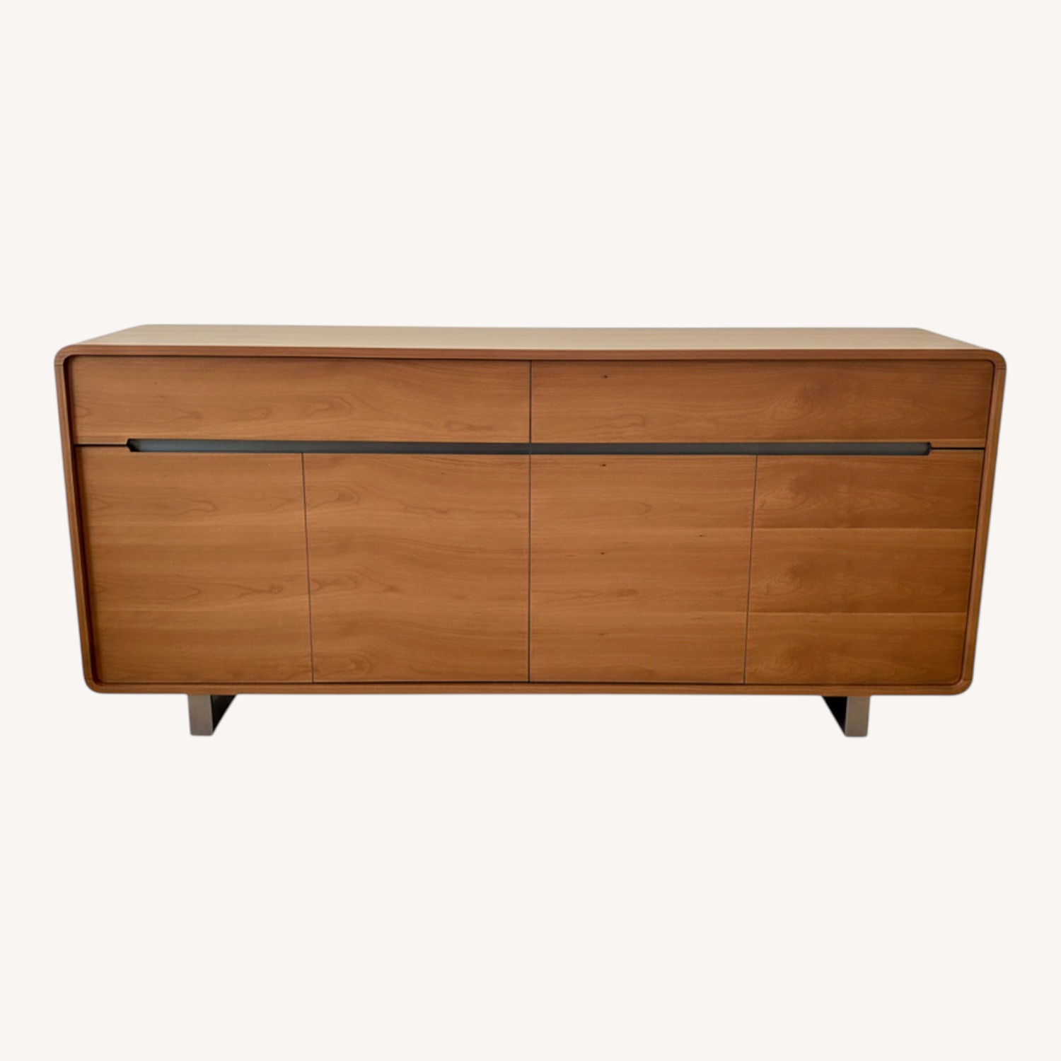 Seller's Notes:In great condition, currently used for dish storage. Wood is veneer in a cherry tone. Key features include: Rounded “waterfall” cabinet edges wrapping from the top down the sides. Long recessed horizontal pull groove running across the cabinet front. Two shallow top drawers with full-extension metal slides. Three lower doors with concealed European hinges. Brushed metal rectangular legs inset slightly from the edges.