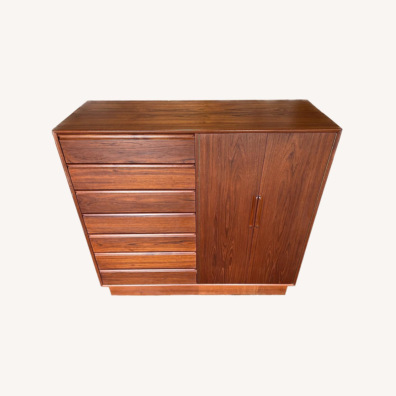 Seller's Notes:Mid-Century Norwegian Modern Teak 14-Drawer Tall Dresser Wardrobe by Westnofa -------------- Beautiful mid-century tall Rosewood dresser wardrobe 6-drawer on left and 6 drawers on the right behind cabinet door. Clean inside and out all drawers slide smooth. Made in Denmark. Good vintage condition. ————- Unit has a few minor scratches on the side and top. All drawers are in a usable condition. ———— See pictures for quality and dimensions. Will be sanitized before pick up. Pet and smoke free home. Reasonable offers are welcome!