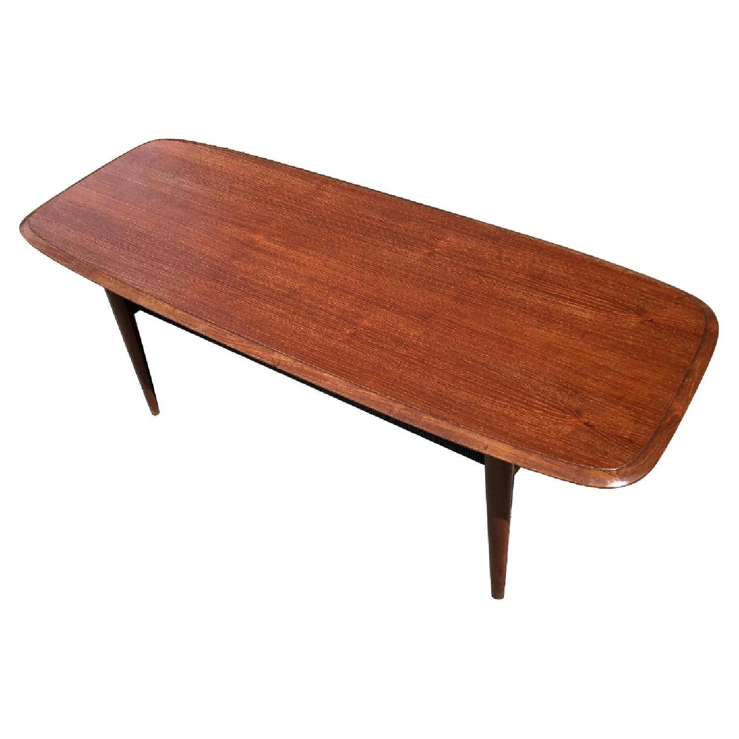 Seller's Notes:Absolutely stunning mid century teak coffee table. This table is beautiful and has been restored to perfection. Webbed netting creates a convenient shelf for books or magazines. There's no visible name or manufacturer on this piece but it's impeccably made and constructed. It's taller than your modern coffee table, so make sure you look at the dimensions. 57" long. 21.5" tall. 21.5" wide