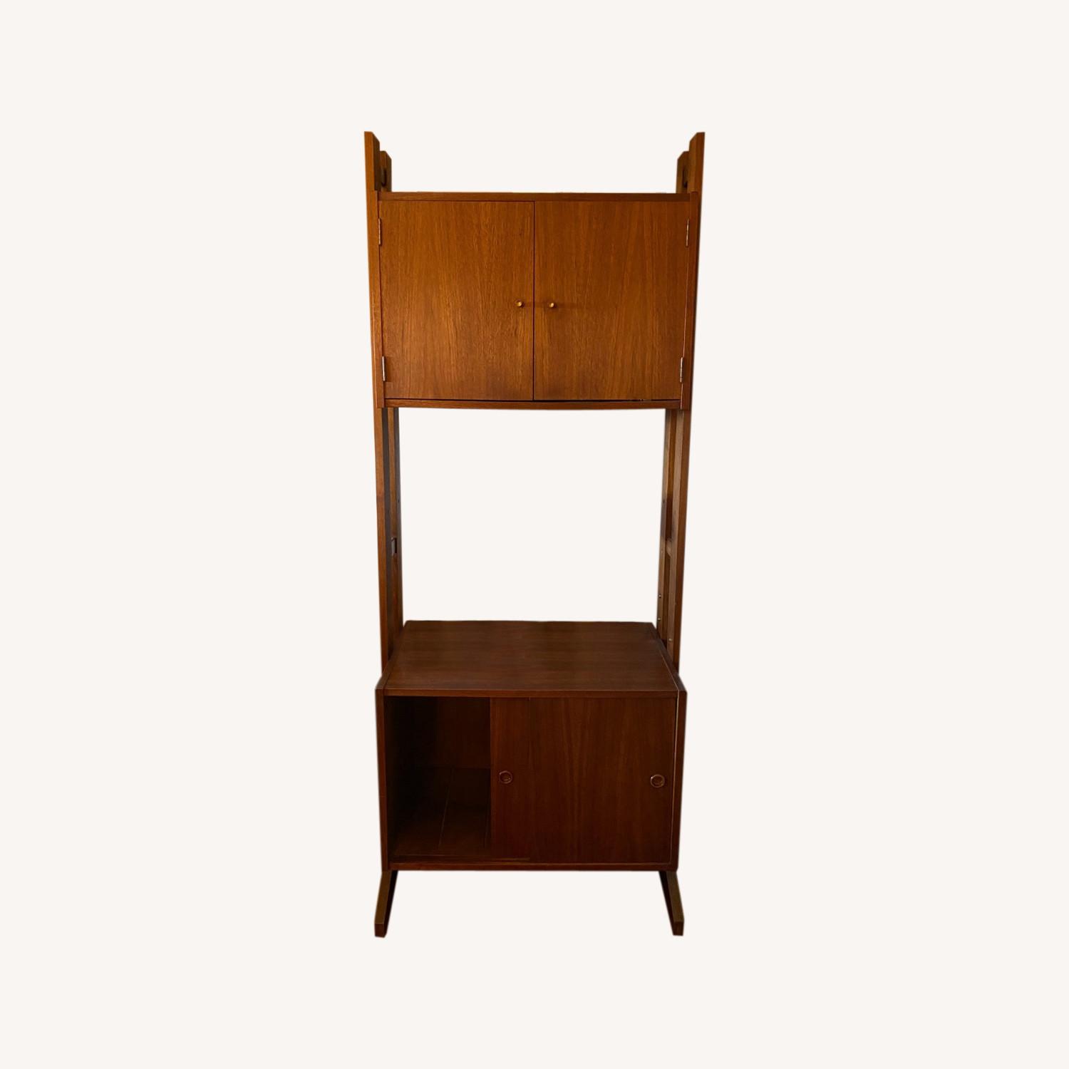 Seller's Notes:This free-standing mid-century storage unit is the perfect addition to your living room. Plenty of storage in the top and bottom cabinets. The bottom cabinet has 2 sliding doors. The back of the top cabinet has been cut out to fit audio components (as seen in the last picture). In fantastic shape. A rare find.