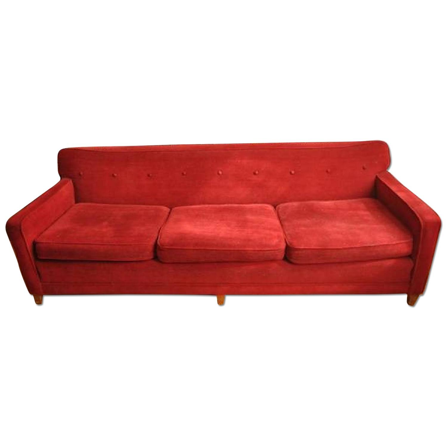 Seller's Notes:Very nice vintage sofa in gorgeous red velour, mid century style. 86" wide x 28" high x 33" deep. 3 removable seat cushions and wood feet. This is a very solid piece of furniture. heavy wood with lots of spring in the cushions. Very good vintage condition from a clean, smoke free and pet free home. Purchased from an estate sale in NYS. Located in park slope in an elevator building.