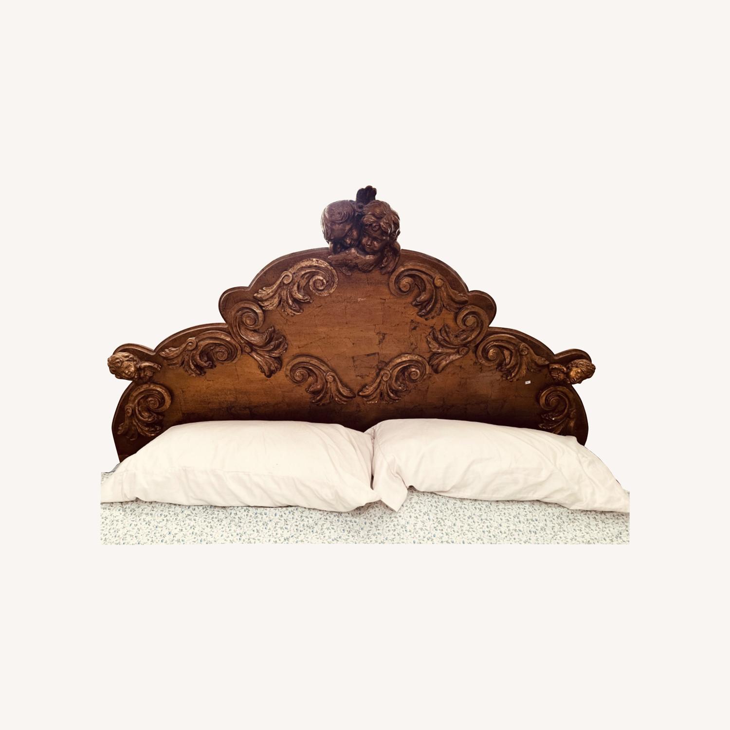 Seller's Notes:One Of A Kind Vintage Giltwood Cherub King Size Headboard — Entire bedroom set available. Mid Century Vintage Rococo Style Giltwood Italian King Sized Headboard with Cherub Angels Throughout. Over 50+ years old. Truly one of a kind, hand carved gilt wood. Dimensions: (L) ~84” (H) ~65” Entire bedroom set available, additional items/furniture available: • 2 night stands: (L) 48” (D) 18” (H) 21” • 4 door dresser with 6 pull out drawers: (L) 84” (D) 20” (H) 30” • matching mirror: (L) 54” (W) 48” Condition: Like New! Color: Gold/Bronze So unique you’ll never see it in the stores! Sold separately or as a set!