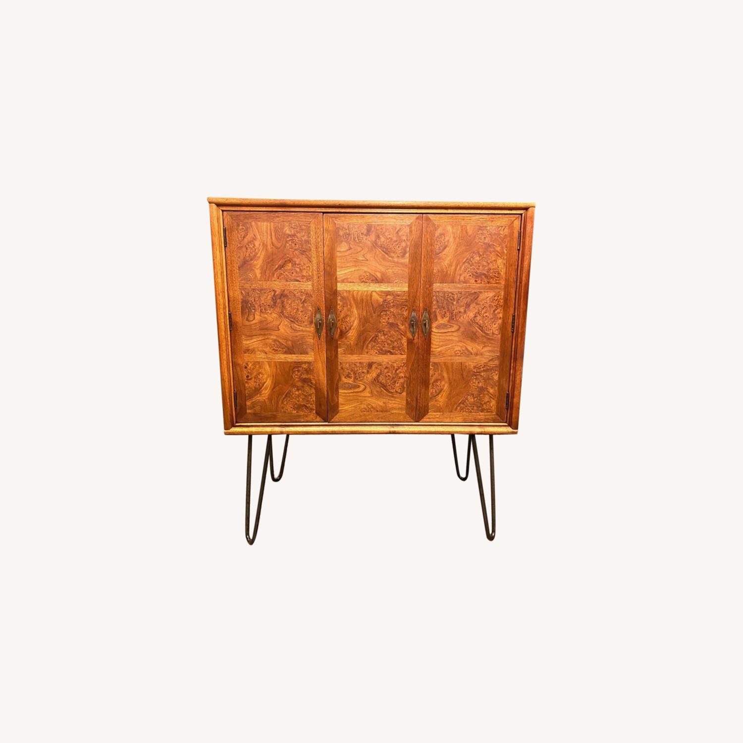 Seller's Notes:Beautiful Mid Century Walnut Burl Cabinet w Hairpin Legs by Founders Co 32 L x 18 W x 39 T In excellent condition Four drawers, three panel doors with original brass hardware. Pick up option is available in Bed Stuy Brooklyn between Marcy and Tompkins