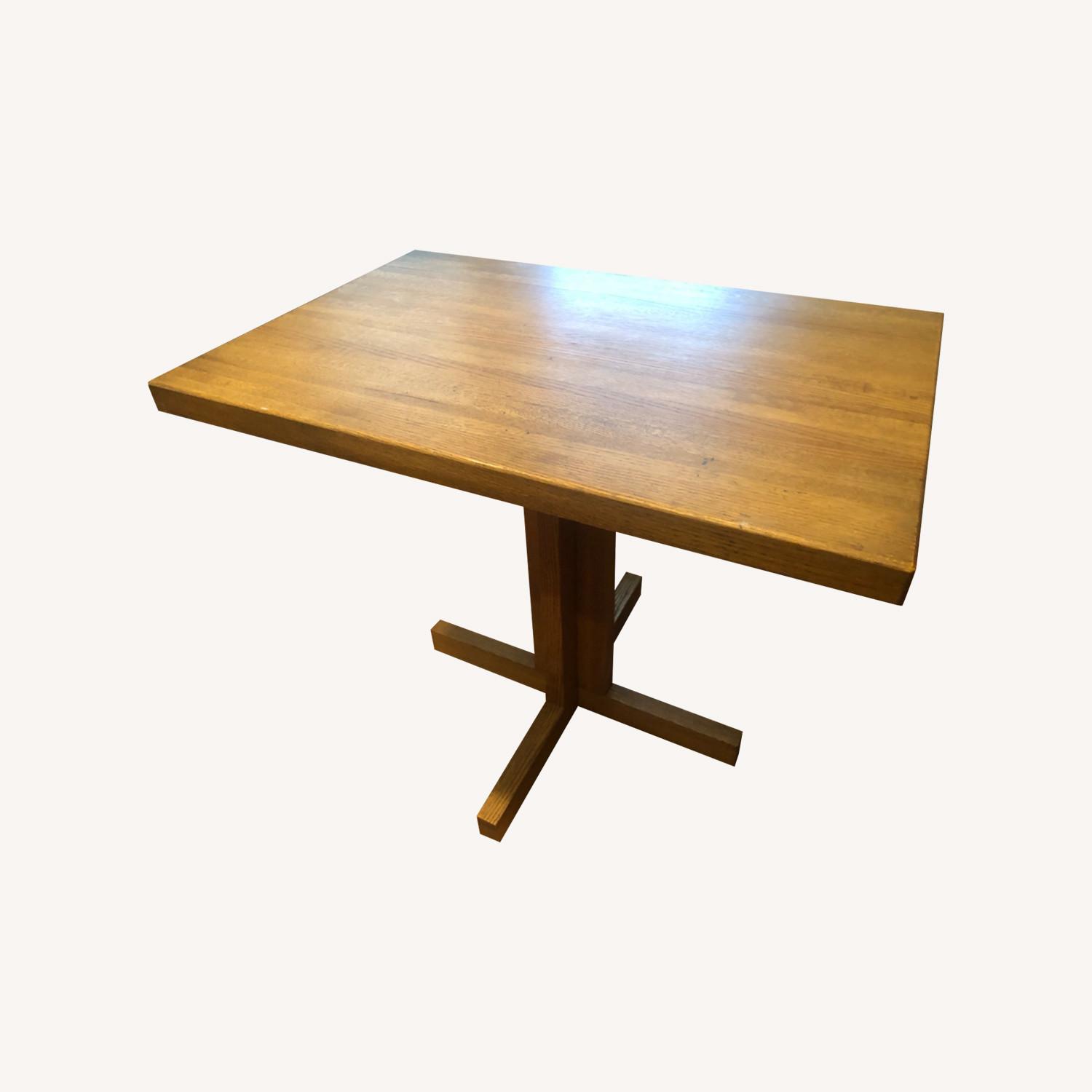 Seller's Notes:Great for small spaces! Compact size solid wood midcentury butcher block table. Pedestal design allows for extra chairs and easy seating. Light color oak. Excellent condition.