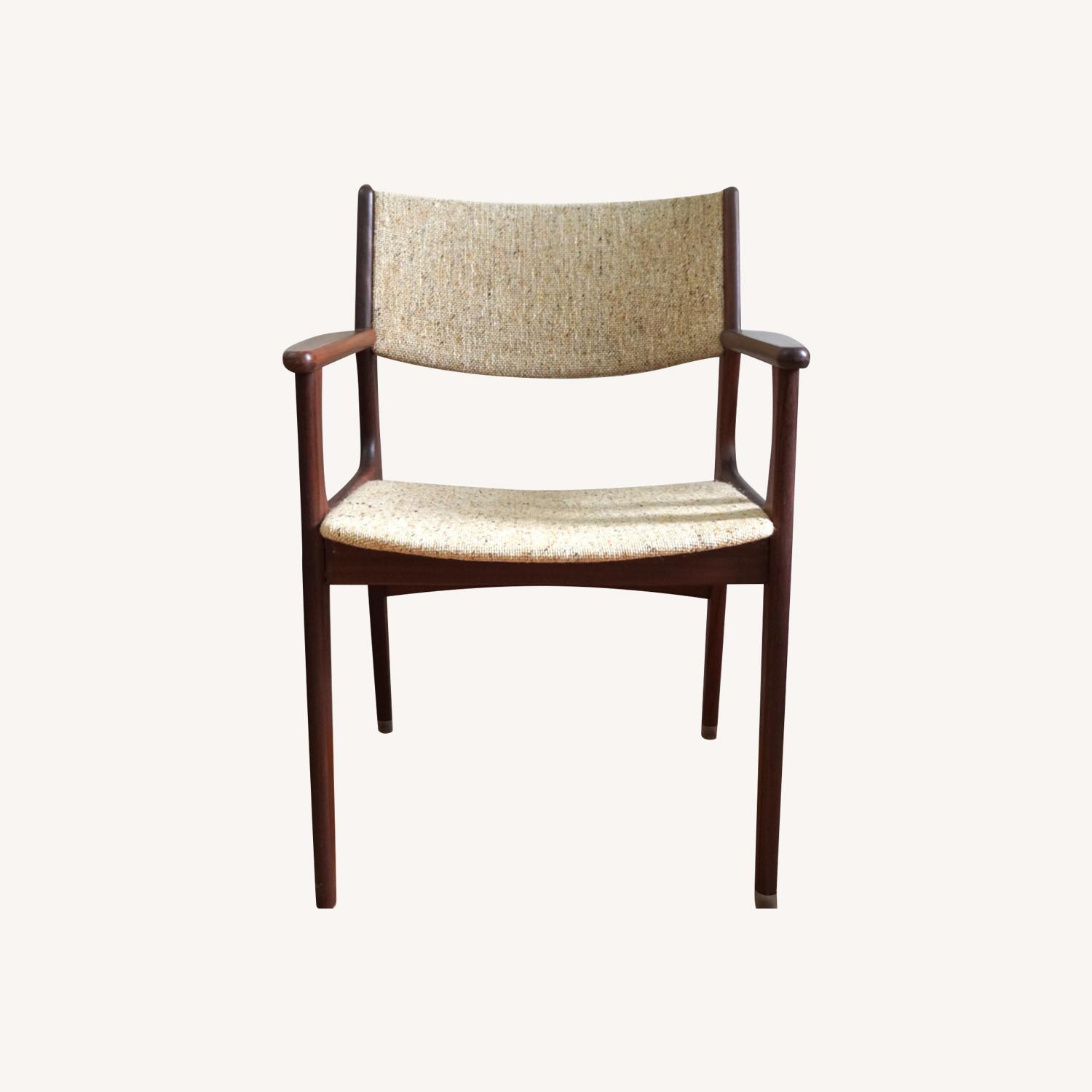 Seller's Notes:A set of 4 midcentury Danish Teak dining chairs. Inherited from the elderly previous owner of the house, so I believe they are decades old. Original upholstering, with a lovely curvature to the frame in the armrest.