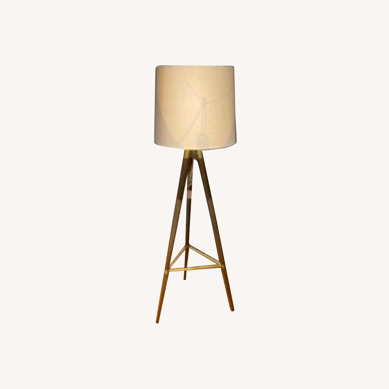 Seller's Notes:Excellent condition. Walnut wood legs, brass hardware and soft-white fabric shade. Beautiful tripod lamp!
