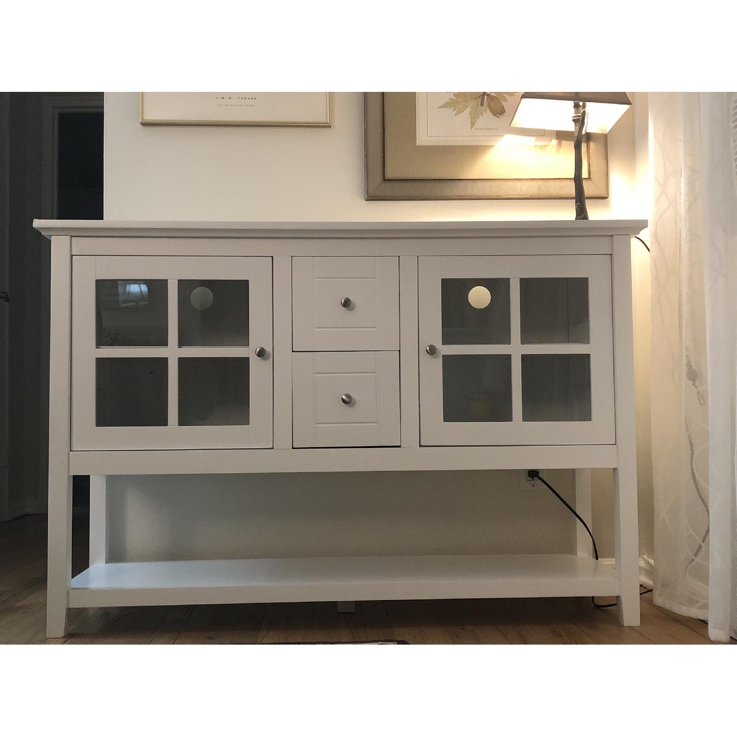 Seller's Notes:This is a beautiful and brand new piece of furniture. I bought it a week ago online, assembled, yet it doesn’t fit to my living room the way I thought it would. It’s in impeccable condition. Top shelf came with a minor scratch on the corner which can be easily concealed. Stylish and versatile cabinet designed to accommodate most flat-panel TVs up to 55" and at 35" high. All of your media components will be impeccably organized on adjustable shelves behind two framed glass doors ensuring easy visibility and an at-a-glance view of your movie and game collection. Two center drawers are ideal for storing remotes, small devices, additional HDMI cables and more. Lastly, utilize the spacious lower shelf for storing books, throws and home decor favorites. The options don't stop at media storage, however. This console also doubles as a splendid kitchen and dining room buffet cabinet. At nearly counter height, the top is perfect for serving drinks and appetizers at your next dinner party or wine tasting. All of your table linens and fine dishes can beautifully displayed on adjustable shelves behind glass doors and two drawers make storing flatware, coasters and corkscrews effortless and tidy. Whether your design tastes lean toward modern, rustic, farmhouse or country, this 53” console buffet will become an instant success in your home. Features: • high-grade MDF and tempered glass construction • painted finish • versatile use as a TV console or buffet cabinet • 2 framed glass doors • 2 adjustable shelves • 4 pre-drilled wire management openings on back panel • 2 drawers • 1 lower shelf • unique 35" height • accommodates most flat panel TVs up to 55" • dimensions: 53 x 16 x 35H • weight: 99 lbs • weight capacity: 250 lbs • opening shelving area between bottom shelf and cabinet is 47"wide x 11-3/4"deep x 9-7/8" high • cabinets behind glass doors are 17-1/8"wide x 14-1/2"deep x 16 7/8"high with an adjustable shelf in the middle • shelf behind glass door is 17-1/8"wide x 14-1/2"deep • drawers are 9-1/2"wide x 14"deep x 8" high • distance from floor to bottom shelf is 2-1/8" • this piece is finished on all sides