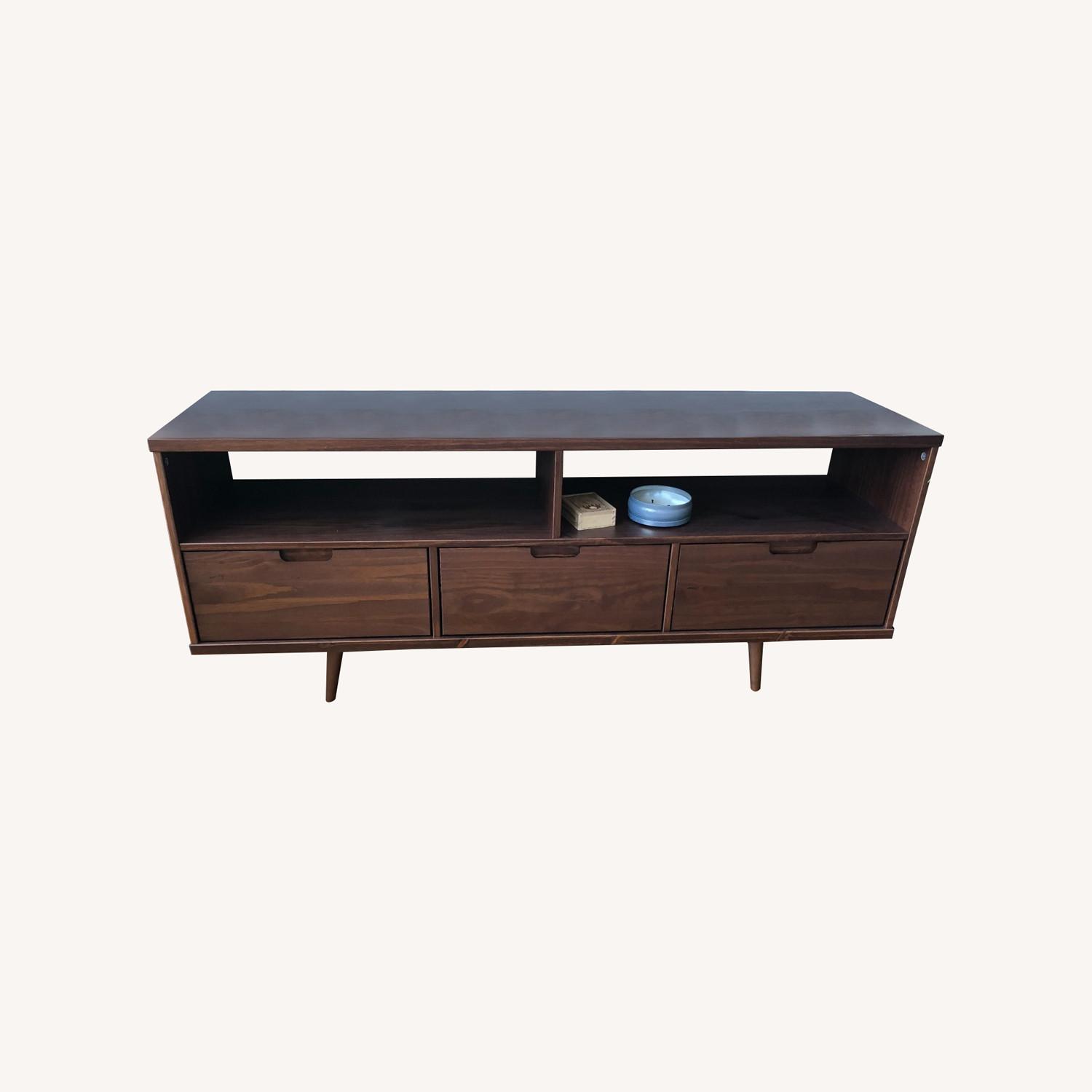 Seller's Notes:Excellent like new condition, the sleek and chic design boasts mid-century modern minimalism, with a stained finish available in walnut or caramel to complement your decor. The console features two open shelves and three drawers with cutout handles, providing ample storage space for all your entertainment needs. Constructed with solid pine wood, walnut color.