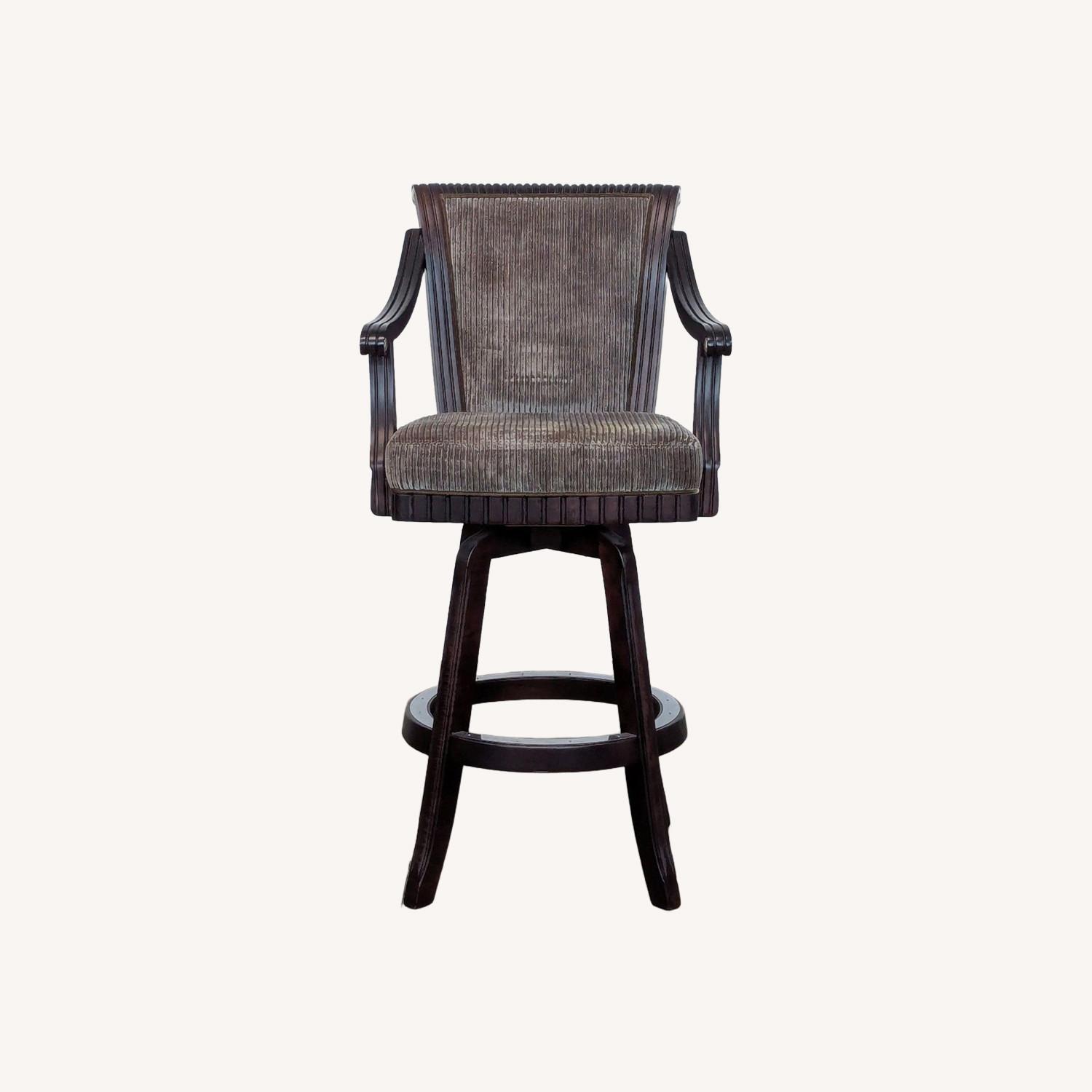 Seller's Notes:Handcrafted, the bar stool is made of selected American maple hardwoods using a 12-step state-of-the-art finishing process used to achieve the rich finish. Ornate hand-carved elements grace the arms, rolled back, and seat base.