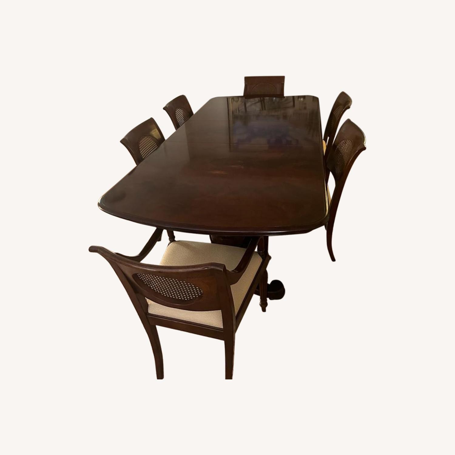 Seller's Notes:The table has two pedestals and comes with 2 armchairs and 4 side chairs. It also has two 20" wide leaves. It is 96" long when one leaf is installed, which is how it is shown in the pictures. It is in very good condition, except for the blemish that is referred to below. The chairs are also in very good condition.