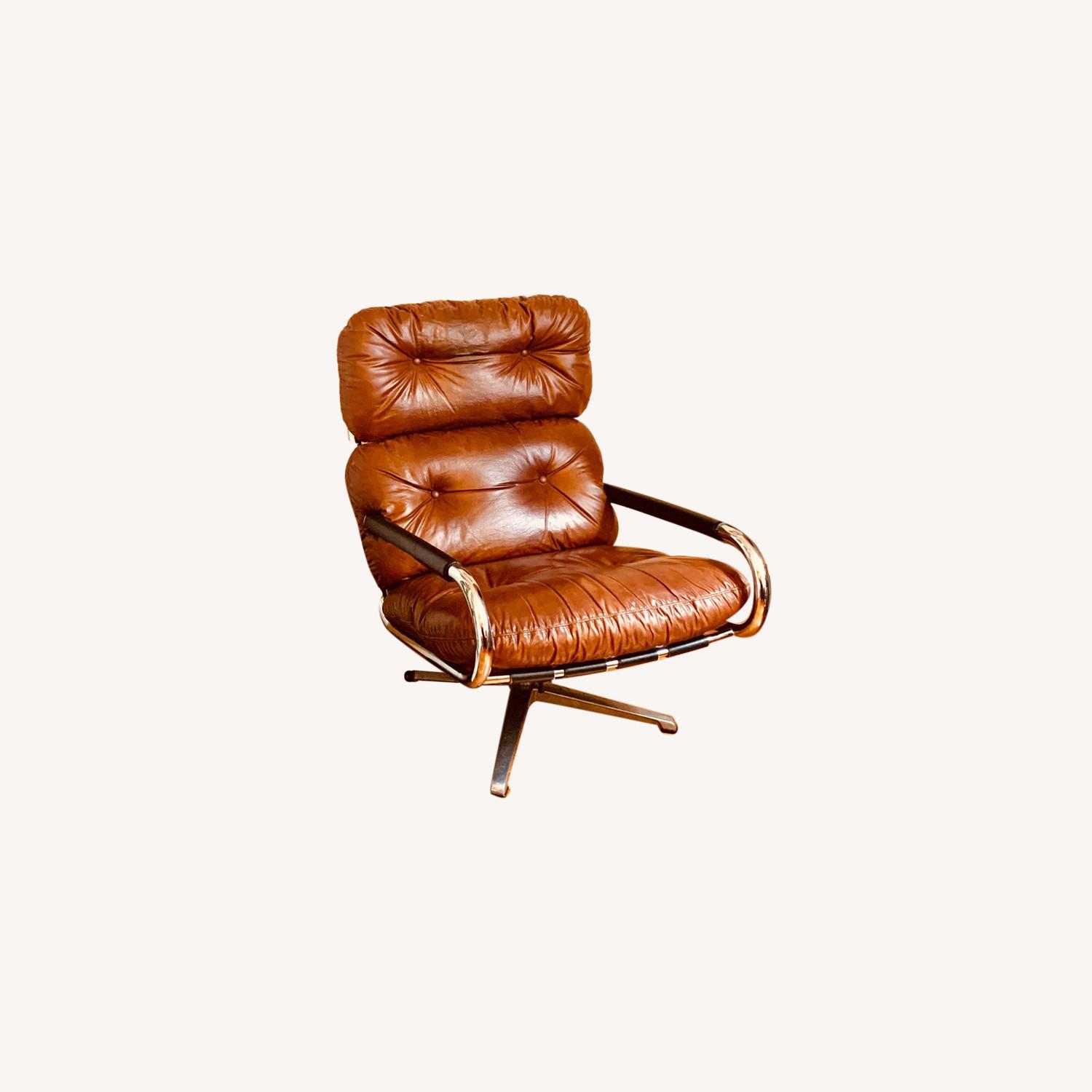 Seller's Notes:Directional Furniture brand leather and chrome swivel lounge chair with matching ottoman. Designed by Milo Baughman. Purchased at a really cute vintage & antique furniture shop upstate. We love it but we're having a baby and need to make space! Chair is 36" tall, 27" wide, 38" long Ottoman is 16" tall, 27" wide, 18" long
