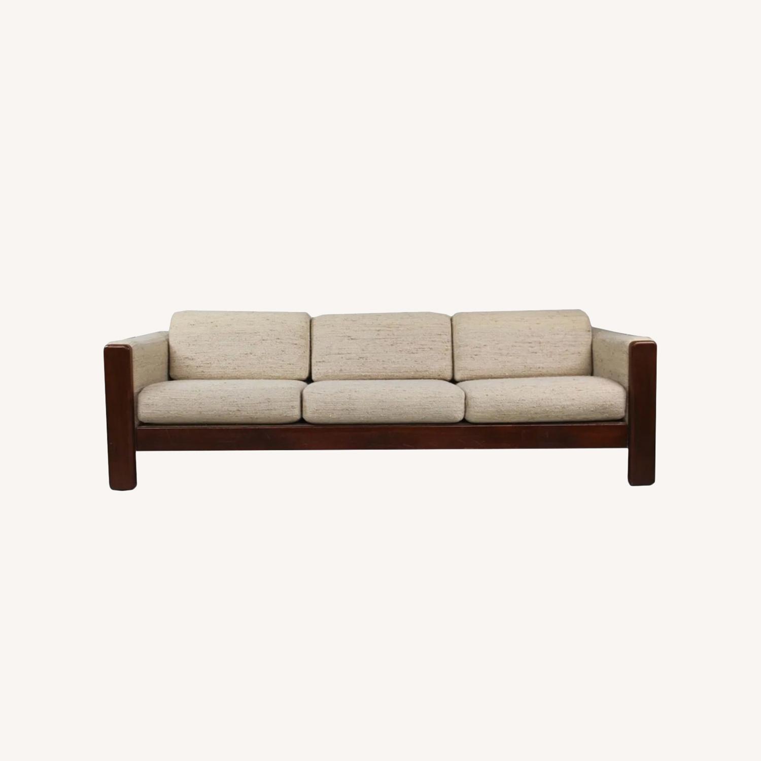 Seller's Notes:Minimalist Postmodern 3-Seat Sofa for Knoll by Jim Eldon. This minimalist two seat sofa is upholstered and has simple wooden frame. There is no tag from Knoll as it must have been reupholstered by their Upholsterer Citron. This is designed by Jim Eldon.