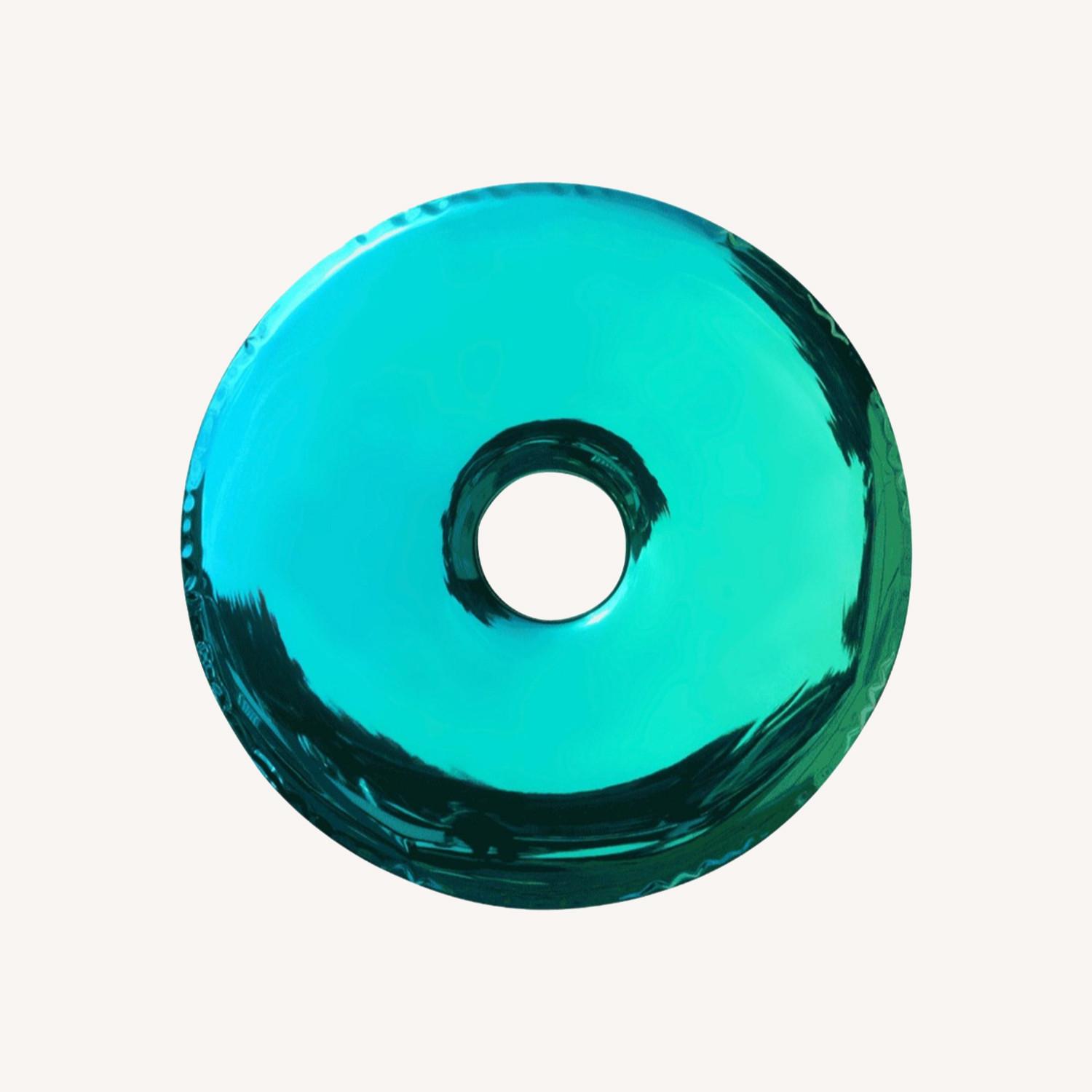 Seller's Notes:"Rondo 95" contemporary mirror by Zieta is a sculptural statement piece, pushing the boundaries of what's possible with mirror and materiality. It is part of the gradient collection (color: emerald + sapphire). Measures: 95 x 6 cm (37.41" x 2.37"). Zieta is best known for his collection of stools “Plopp” made through the technologist FIDU. With the same principle, Zieta conceived mirror collections made of stainless steel called “Tafla”, “Rondo” and “Rondel”. Two laser-cut metal sheets are first welded together before air is injected between them until they separate from each other forming a three-dimensional object. Link: https://www.facebook.com/marketplace/item/358642640462333/?mibextid=6ojiHh
