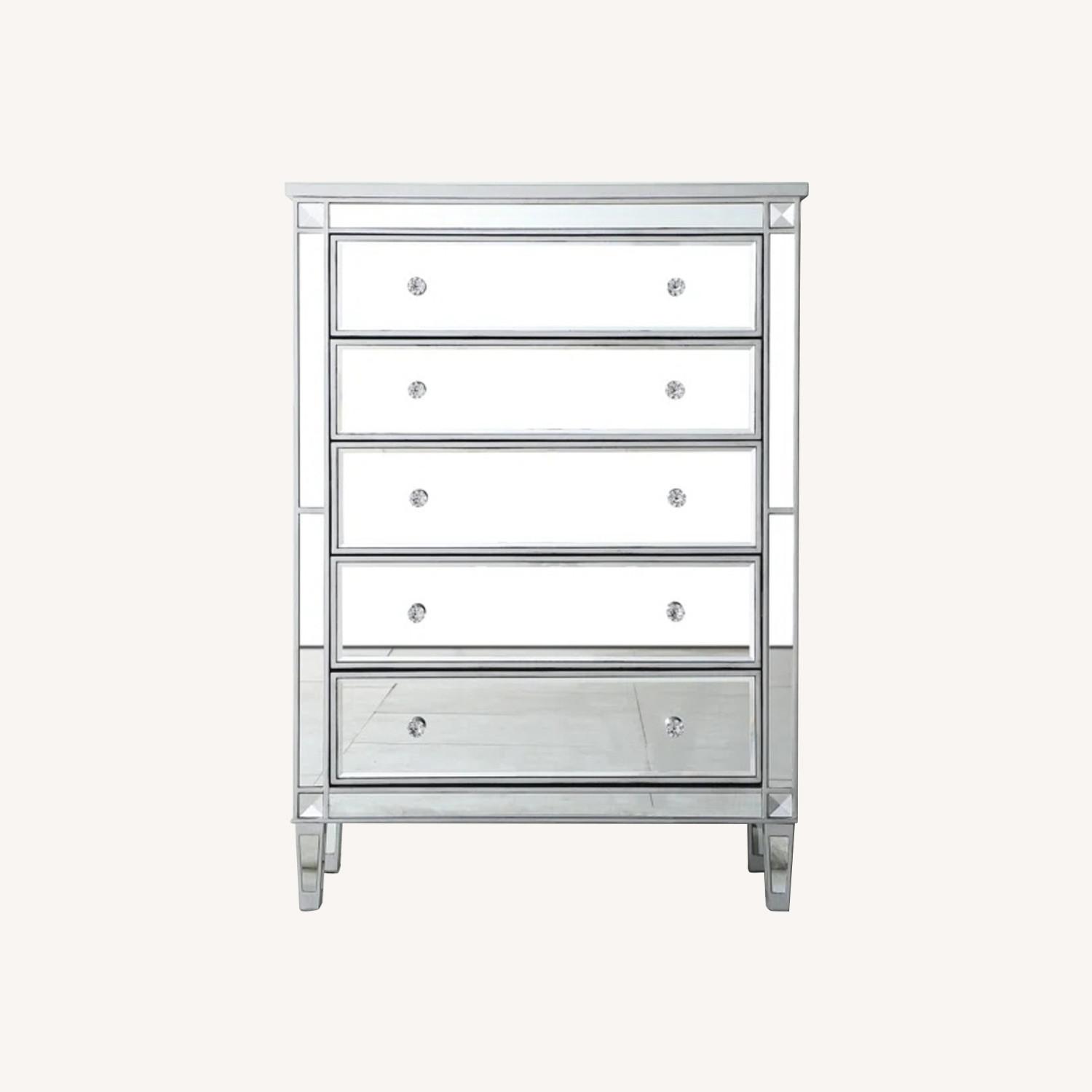 Glam up your master suite with style! This elegantly designed dresser comes with 5 deep drawers on full-extension metal slides and includes a removable felt-lined tray that can be used in any of the drawers. It features a hand-painted, silver finish wood frame adorned with beveled mirror panels, and is accentuated with cut-crystal drawer knobs and corner squares.