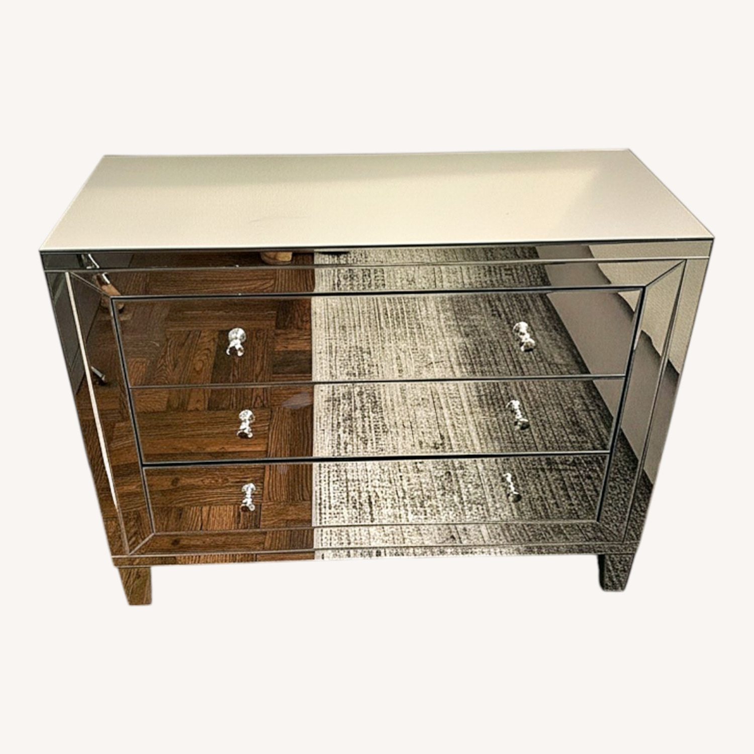 Seller's Notes:mirrored 3-drawer dresser. Has minor crack on the top left corner and a slightly larger crack on the left side, but still very functional and has many years of good use.