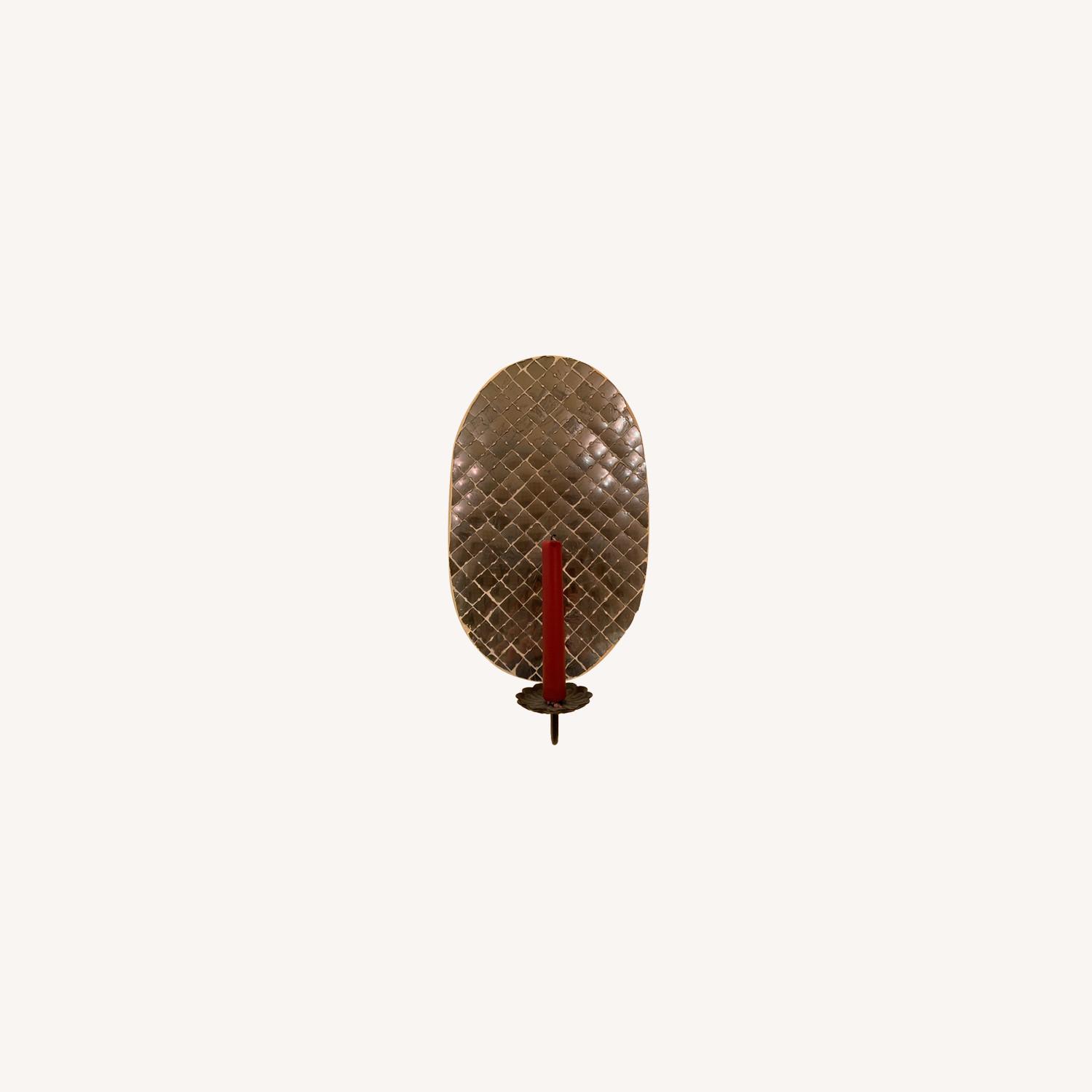 Seller's Notes:This matching pair of candle wall sconces can add light to dark corners or simply be used as a decorative feature. The candle holders are made of iron, while the backing plates have a mirrored, mosaic finish.