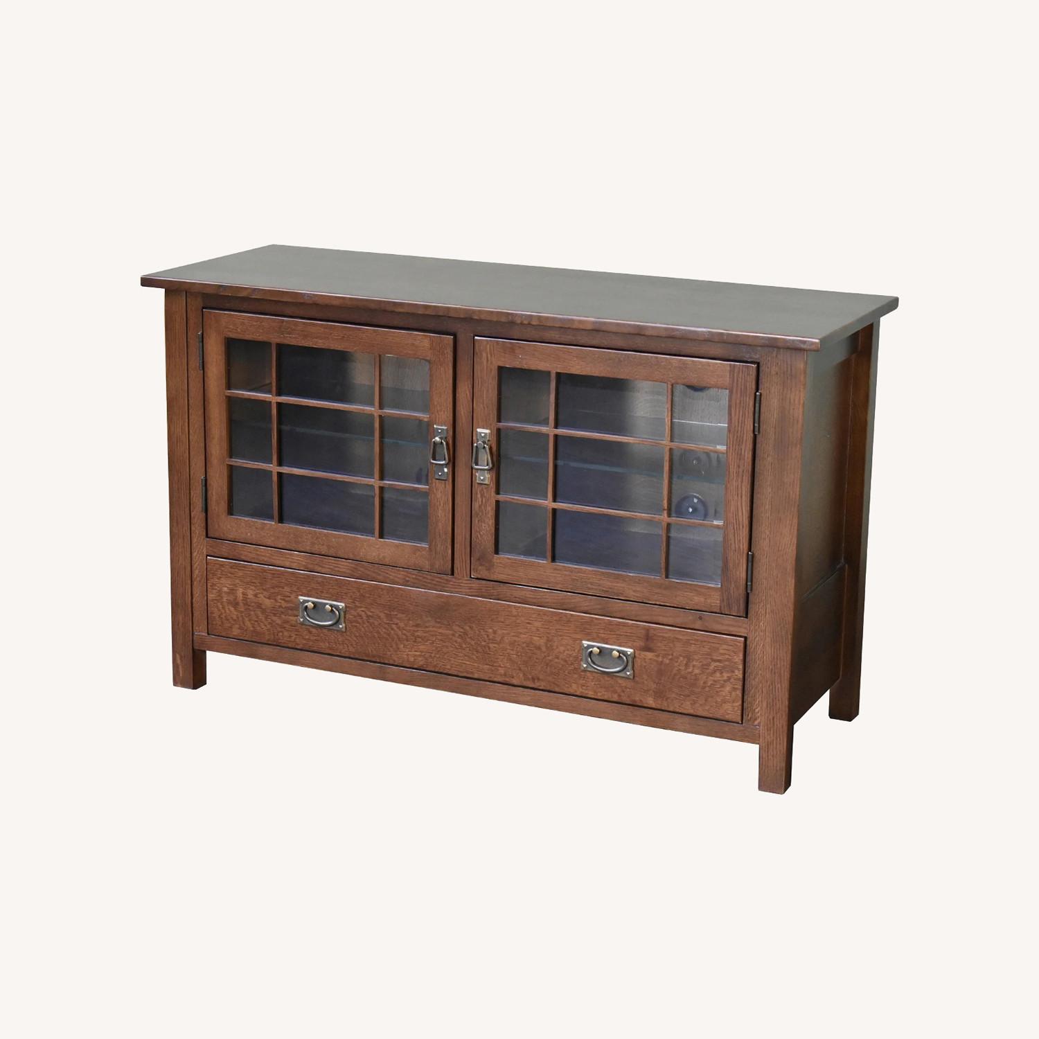 Seller's Notes:To view this listing and many more go to WWW.CRAFTERSANDWEAVERS.COM Use this (Extra5) coupon code to get extra 5% discount on already discounted prices. Our Mission / Arts & Crafts style furniture is made with attention to detail and expertise like that of 100 year old Stickley. - Solid quarter sawn white oak with hand rubbed finish - 1 Drawer with dovetail drawer front and metal glides - 2 Doors with glass shelves behind - Remote can reach components through glass doors - Please request holes for media cables if required Dimensions: Overall: 48W x 18D x 30H Inside Cabinet (with shelves): 21W x 15D x 17H Inside cabinet (without shelves): 21W x 15D x 7H Drawer: 38W x 10.5D x 4H