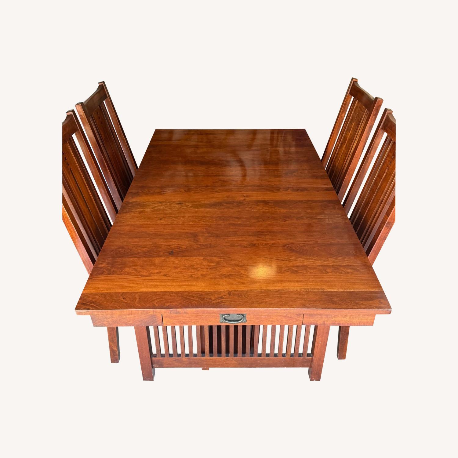Seller's Notes:Beautiful Mission-style solid cherry dining table with 4 matching high-back chairs. Built in October 2002, the piece is stamped “TVC-100 | CCS | Larry P. | 10-02,” suggesting a custom or small-batch maker. The craftsmanship is exceptional, featuring dovetail drawers with full-extension glides and a slatted base in classic Arts & Crafts style. The table originally included two extension leaves, which are no longer available. Still, it comfortably seats 4–6 and makes a stunning centerpiece. The chairs are solid and upholstered in black vinyl, all in very good condition with only minor wear from age.