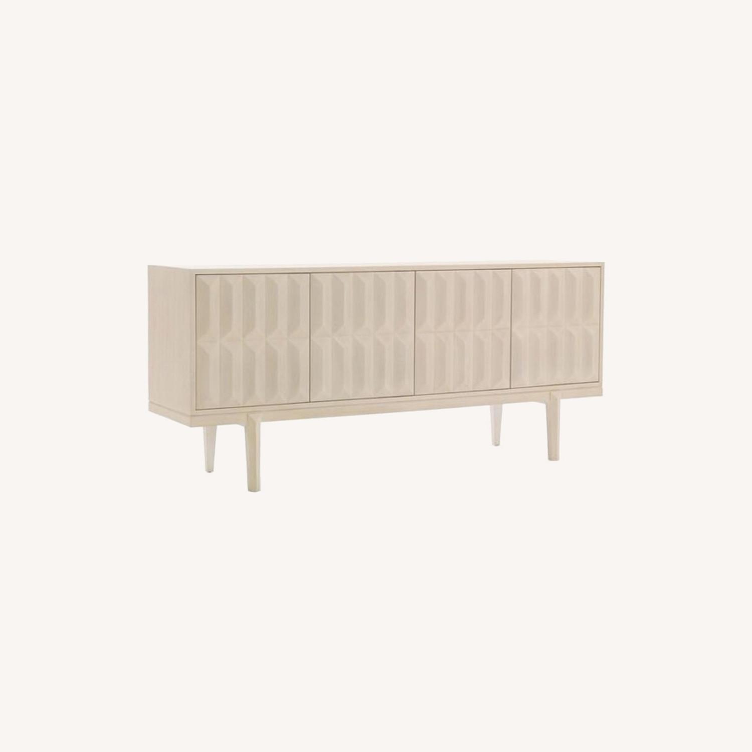 Seller's Notes:We moved and are re-decorating so needed something different. This piece is only a couple years old, and besides some very small nicks and a very faint scratch, it's in GREAT condition. Perfect media console with a lot of storage, great accent piece to any living or bedroom. Modern media console features Mid-century inspired styling with sculptural 3-D door fronts and tapered legs. Crafted from mahogany and finished in matte white, textural console lends a light look and pairs well with other pieces in our collection. Ample storage includes two compartments with adjustable shelves and exit holes for easy cord management. Perfect addition to media and living rooms, as well as halls, entryways, and dining rooms 72 in width x 18.4 in depth x 32 in height Mid-century modern styling Features sculptural 3-D door fronts and tapered legs Crafted from mahogany - finished in same matte white color/finish as our Malibu collection One adjustable shelf for each compartment, 2 cord exit holes per compartment Lends a light look and pairs well with other pieces in our collection Perfect addition to media and living rooms Also works well in dining rooms, halls, and entryways