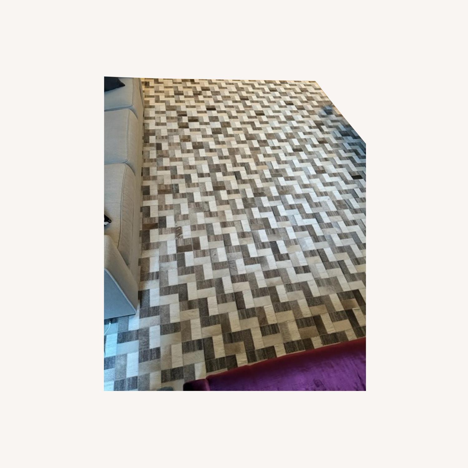 Seller's Notes:Hand-stitched artisan rug features a patchwork design in a textural mix of viscose woven with leather hides in varying light and brindle tones. Works well with modern décor from urban to rural. Three years old. No pets/smoking. Good condition