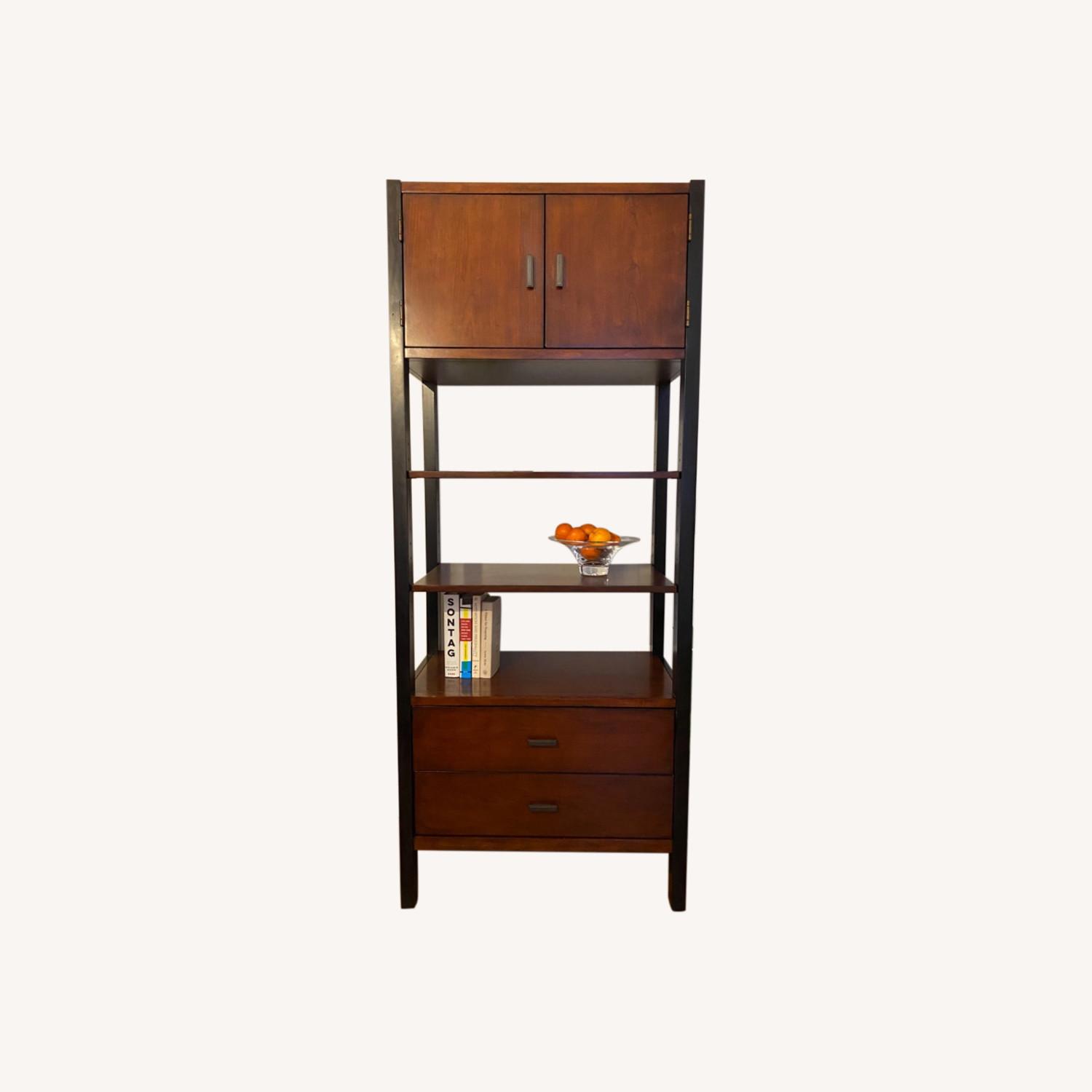 Seller's Notes:Bookcase with Doors and Drawers from Mitchell Gold and Bob Williams Market price: $3,300 Clean lines and a striking mix of materials and finishes, the Mitchell Gold and Bob Williams Bookcase adds one-of-a-kind character to a home office, with rare combination of drawers, shelves, and cabinet. Beautifully figured solid wood features a rich seared mahogany finish, black wood frame and satin brass accents that add a look that is both organic and modern. Drawer runner slightly damaged during move; fixed and re-enforced. Not visible. Dimensions Height: 72 1/2” Width: 30” Depth: 18”