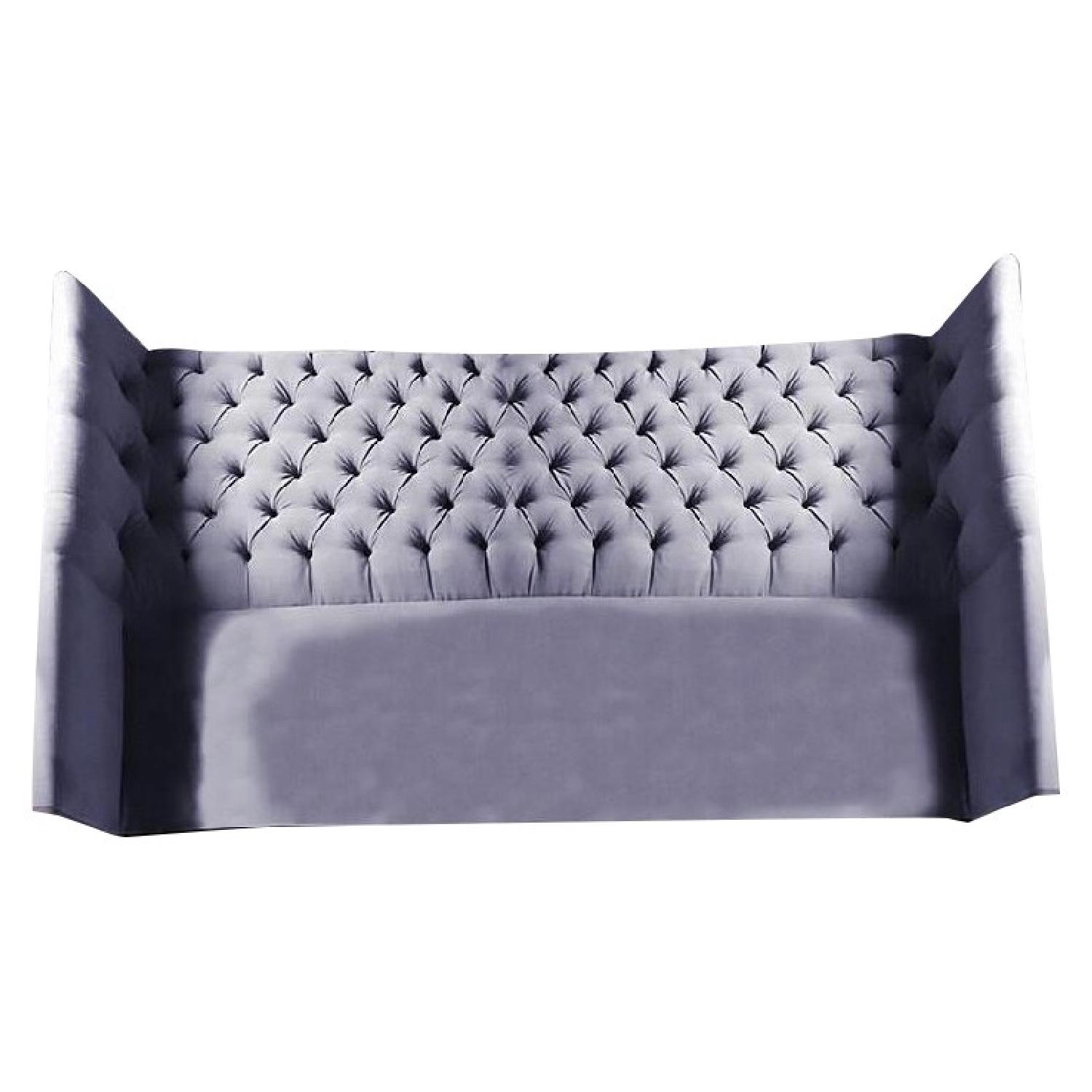 Seller's Notes:too large for current home custom made KING velvet tufted headbord soft lavender.lilac shade great condition, beautiful style
