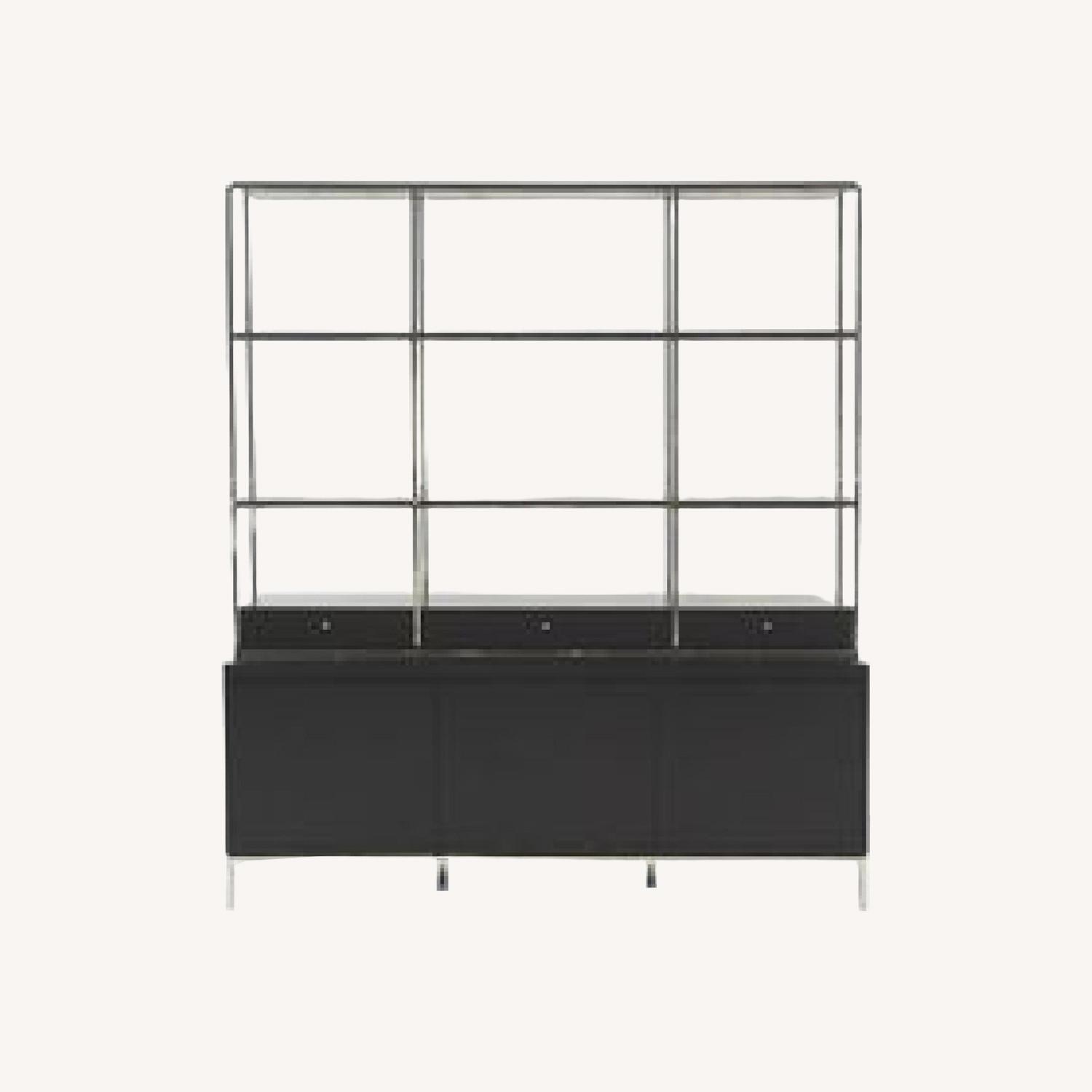 Seller's Notes:Mitchell Gold + Bob Williams Manning Collection Media Console and Bookshelf. In dark brown and chrome finishes, with cabinets, interior shelves, drawers and shelving, provides a extensive storage and display options with style. Bookshelf may be detached from console / cabinet. Item is in great condition.