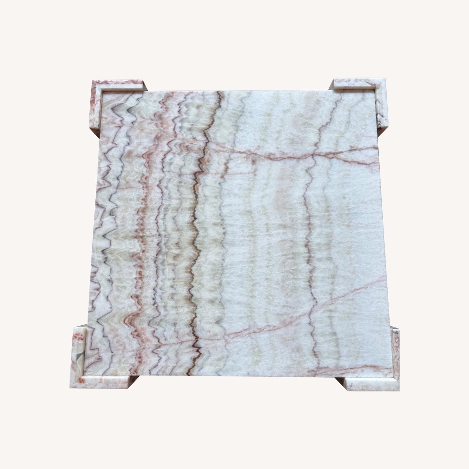 Seller's Notes:A gorgeous centerpiece for a seating area, this coffee table is crafted from onyx, a semiprecious stone with banded layers of color that bring pattern and natural beauty to any space. This low, 40"-square style is designed with onyx slabs set over a sturdy MDF frame. The beautiful colors and line running through the stone make this piece of one of a kind. It is the perfect height to accompany living room seating and looks incredible stacked with coffee table books, flowers, small dishes and candles. Dimensions: 40" X 40" X 14"