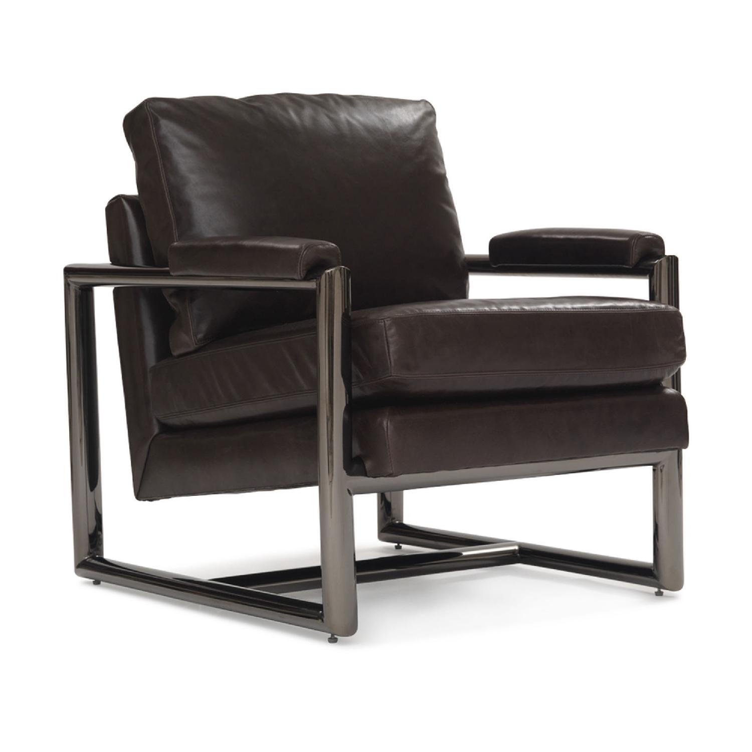 Seller's Notes:Laidback luxury at its finest, the Presley chair combines exceptionally comfortable cushioning and a great pitch to the back with clean lined good looks. Its distinctive metal frame is crafted from oval tubing in polished black chrome and its leather-upholstered cushions feature modern double-needle stitching. - Width: 30" - Depth: 37" - Height: 34" As a floor model this item is heavily discounted because it may have some normal wear and tear.