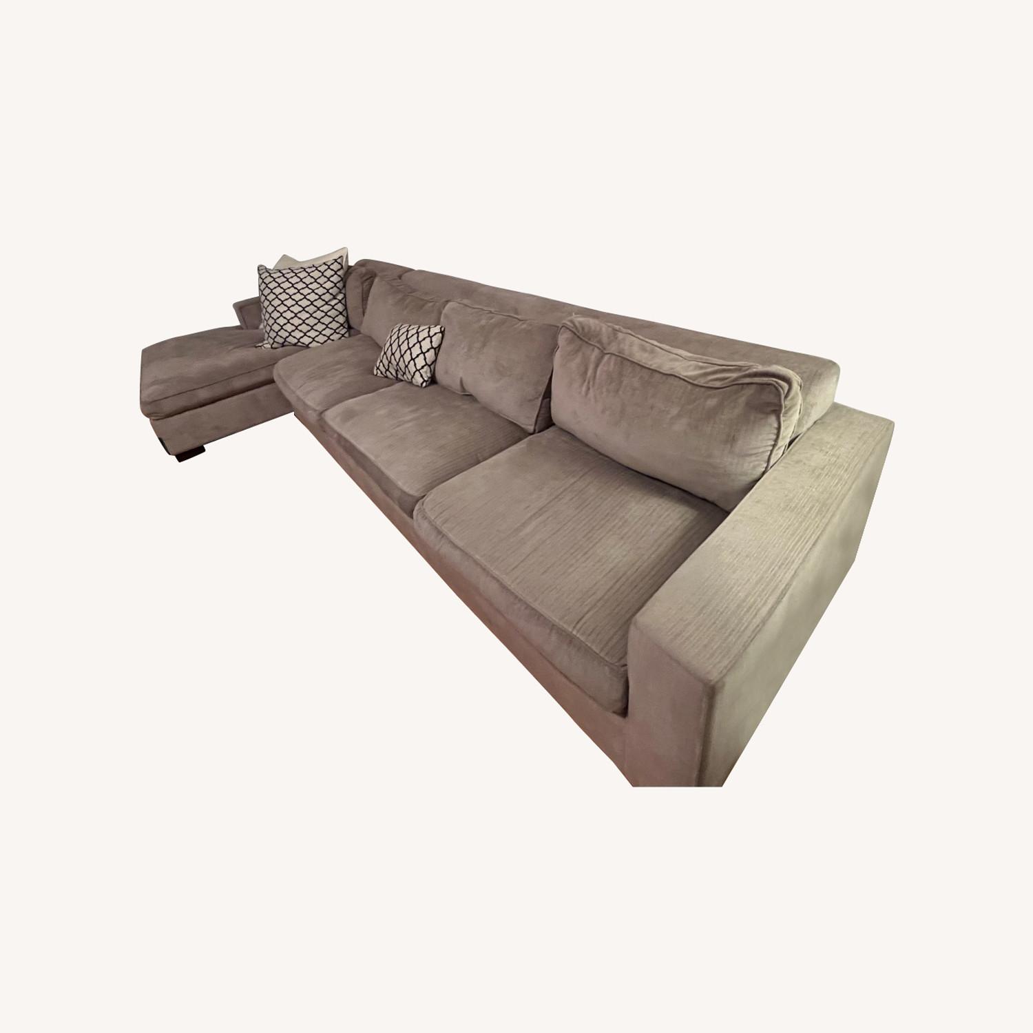 Seller's Notes:Beautiful couch with chaise lounge from Mitchell Gold. Very comfortable - filled with the most high end goose down they offer. Chaise is 63 inches long. The couch is 21 inches high from the armrest to the ground, 25 inches high from the backrest to the ground. There is one scratch at the middle of the back which is hidden behind the pillows