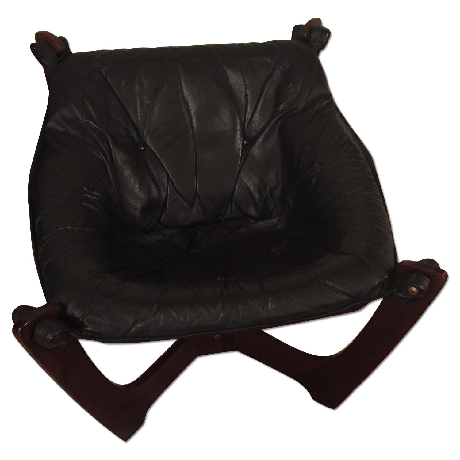 Seller's Notes:Pair danish mid-century modern Møbler Luna Leather chairs -rich, soft black pebbled leather -rosewood stain plywood -durable fabric 'sling' with leather loop supports -dimensions: 30"w x 29"l x 28.5"h -made in Norway Designed by Noregian designer Odd Knutsen, made by Hjellegjerde Møbler in Norway. Probably the most comfortable lounge chairs I have ever sat in, this is solid Danish modern design, made in Norway. These are very similar to the Falcon chair but much more durable. Wood frame can be disassembled for shipping. Condition: excellent, missing one or two buttons, some wear to leather, very small hole in leather (see pic), scratches to frame normal to age of piece. Some original hardware has been replaced.
