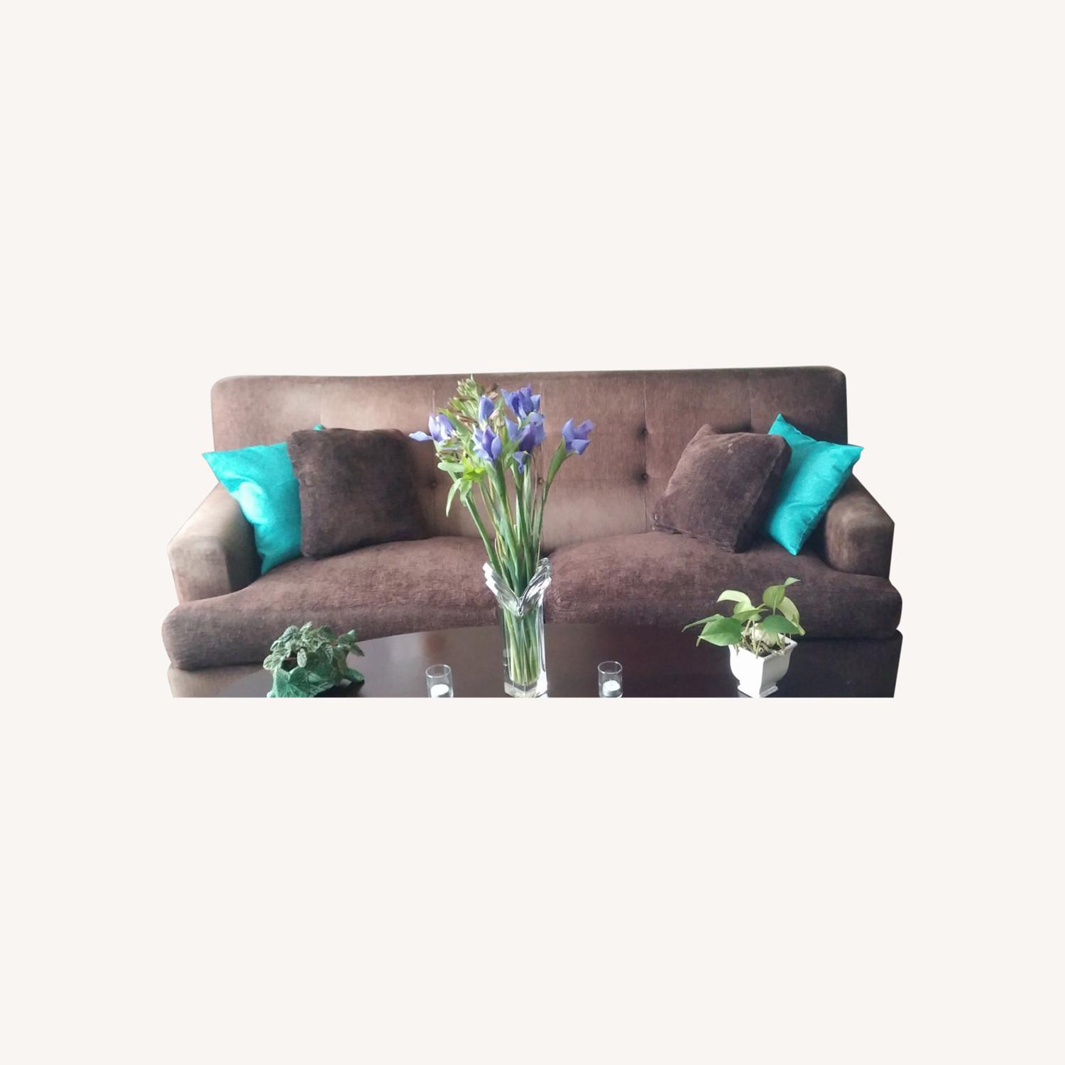 Seller's Notes:Exquisite, over stuffed, (non-allergenic down and foam) textured and tufted SOFA. Rarely used 'cause no television in Living Room, EVER. Deep, Rich Mocha Chocolate hue with a cushy tufted hansomely, buttoned mid high back, comfortable low arms and cloud soft, yet firm, overstuffed seat cushions. This IS Luxury's Lap! Also, BIG MOVING SALE!! More furniture and other items, too.