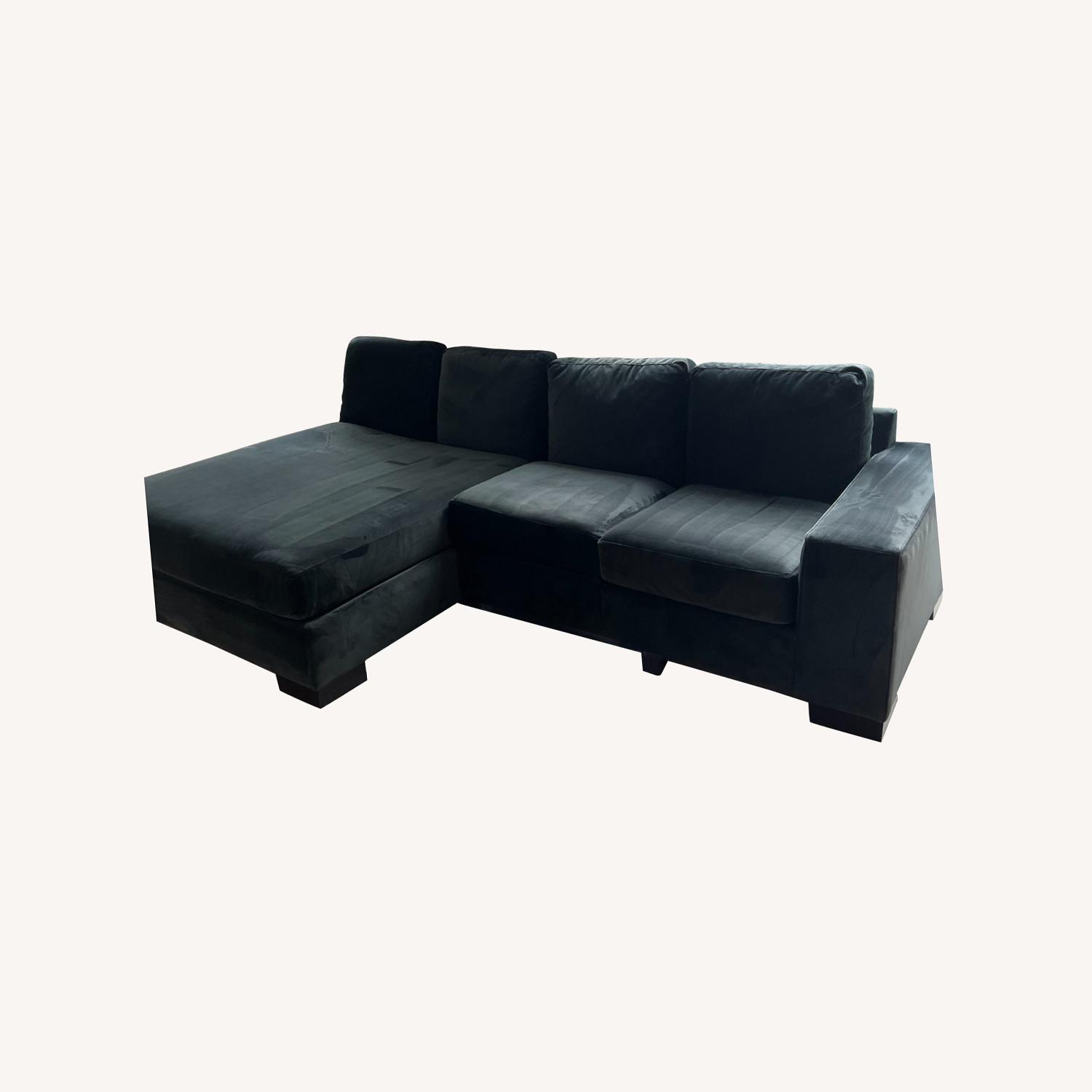 Seller's Notes:This incredible comfortable sectional in gunmetal was purchased at DYPHOR in Williamsburg, BK. The velvet material is very easy to clean. It's in excellent condition with some minor scratches on the wooden legs. These are not visible unless you get down on the floor and examine closely. We are sad to have to sell it. We moved and don't have the room for the "L" anymore.