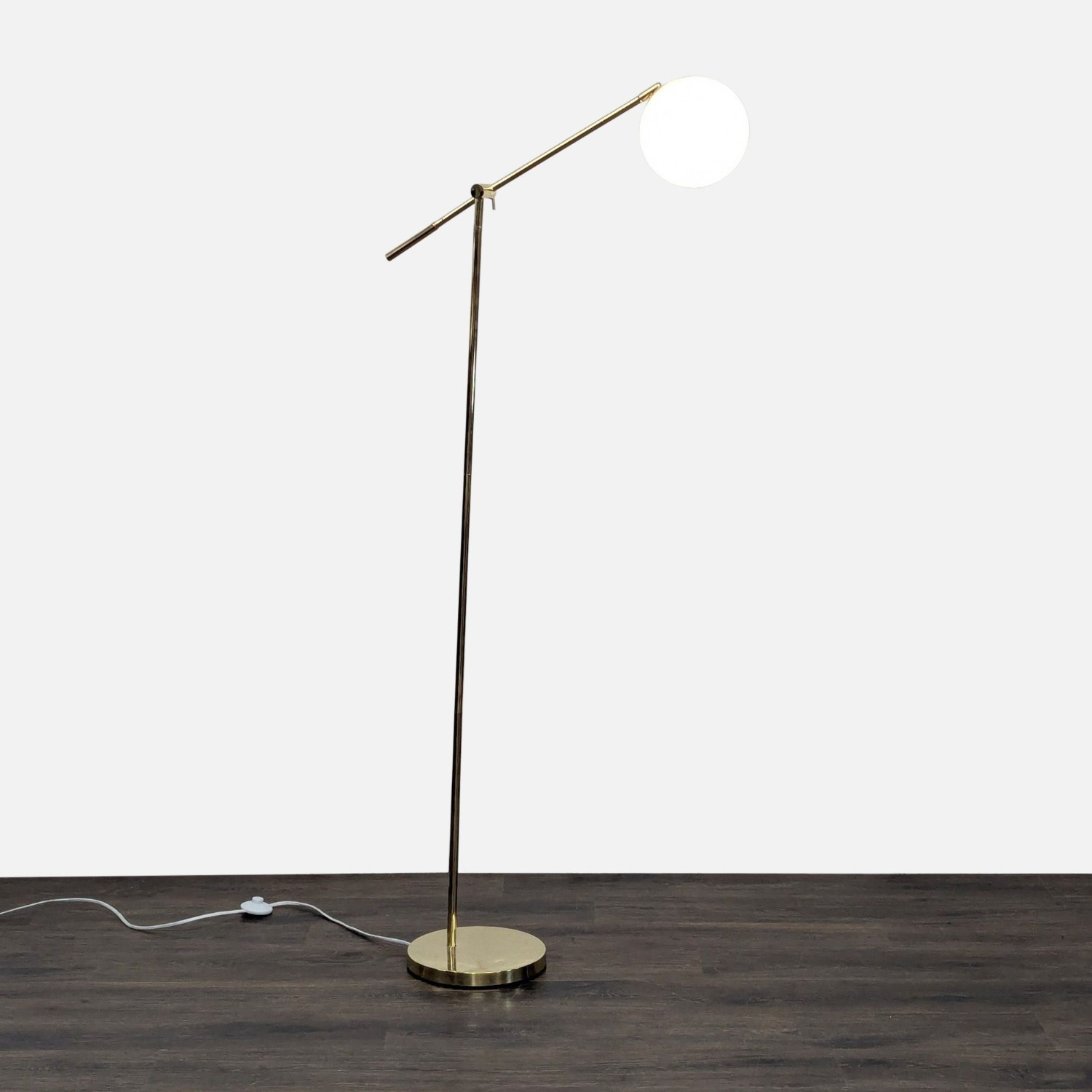 Seller's Notes:This modern floor lamp features a sleek brass finish and a stylish round base. The adjustable arm lets you direct light where needed, while the frosted glass globe shade gives a soft, warm glow. Perfect for living rooms, bedrooms, or offices, this lamp adds a touch of elegance and practicality to any space.