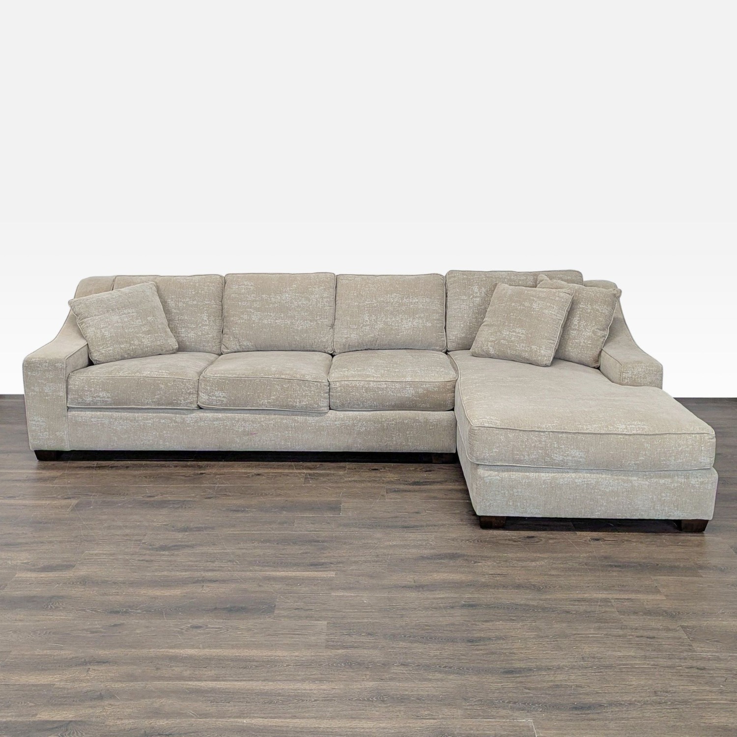 Seller's Notes:This comfortable beige sectional features a spacious chaise lounge, three seat cushions, and comes with matching throw pillows. The clean design and soft fabric make it perfect for any living room. Enjoy plenty of seating for family and guests. Excellent choice for relaxation and style.
