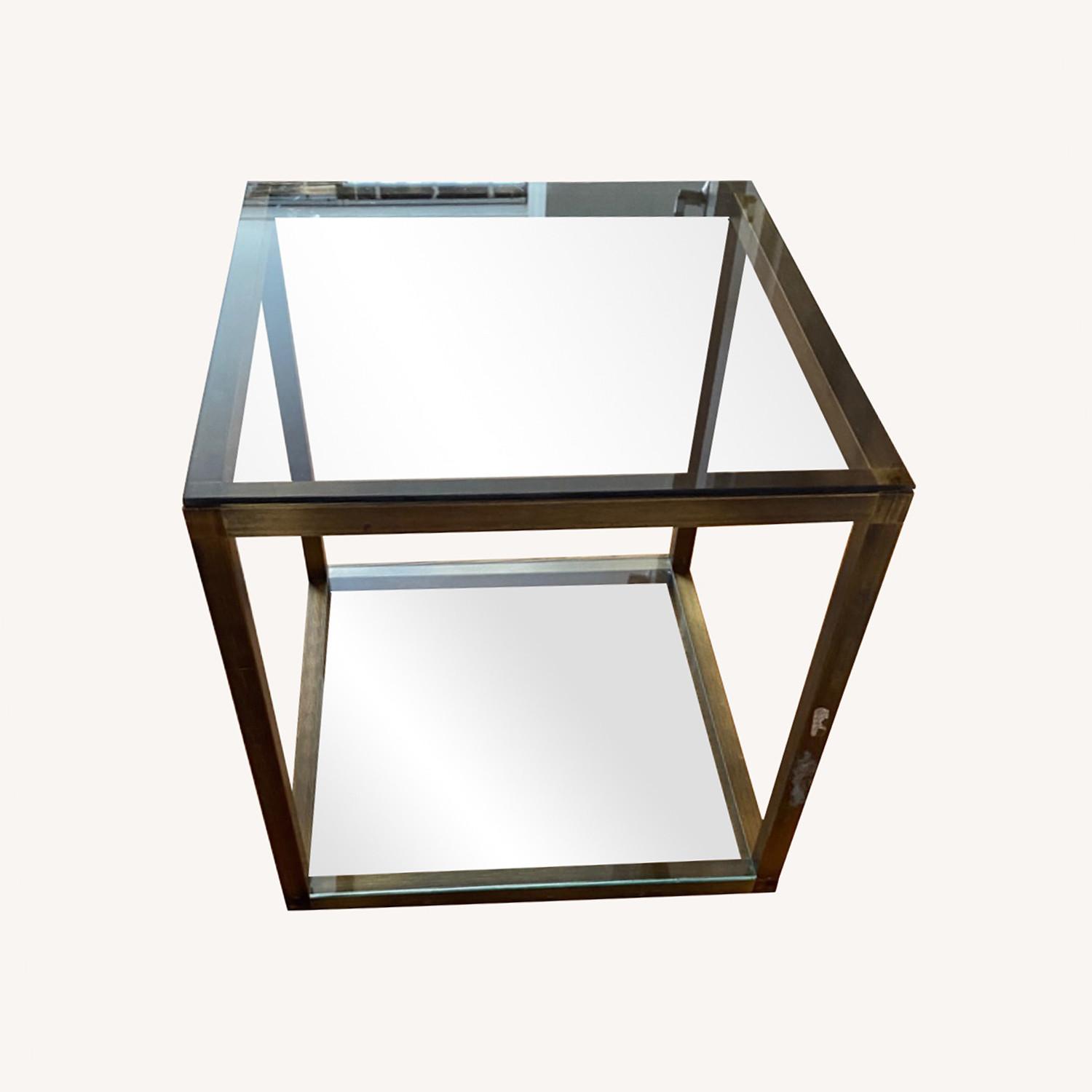 Seller's Notes:This stunningly classic modern table is vintage and timeless. A perfect side table with bras distressed finish and glass on top and bottom. One minor blemish where a sticker was removed. Goes in any decor.