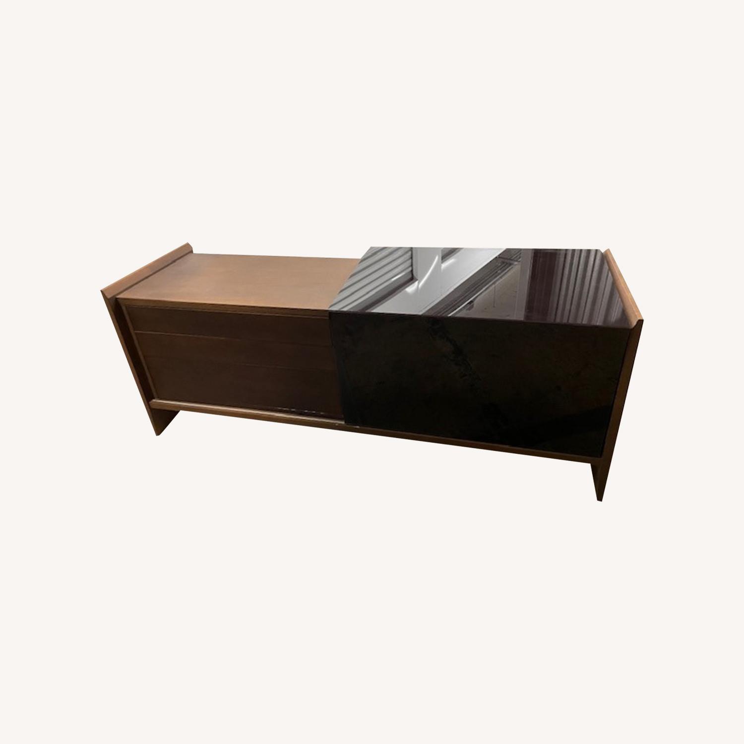 Seller's Notes:Saccaro Brand. Brazillian hand made modern credenza. Exotic hardwood and sliding glass enclosure. Not shown glass shelves included. 77.5" long x 24" wide. Needs a little bit of restoration to bring it back to it's former glory.